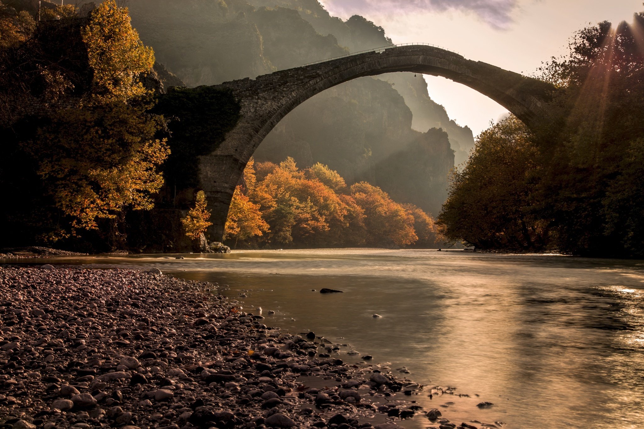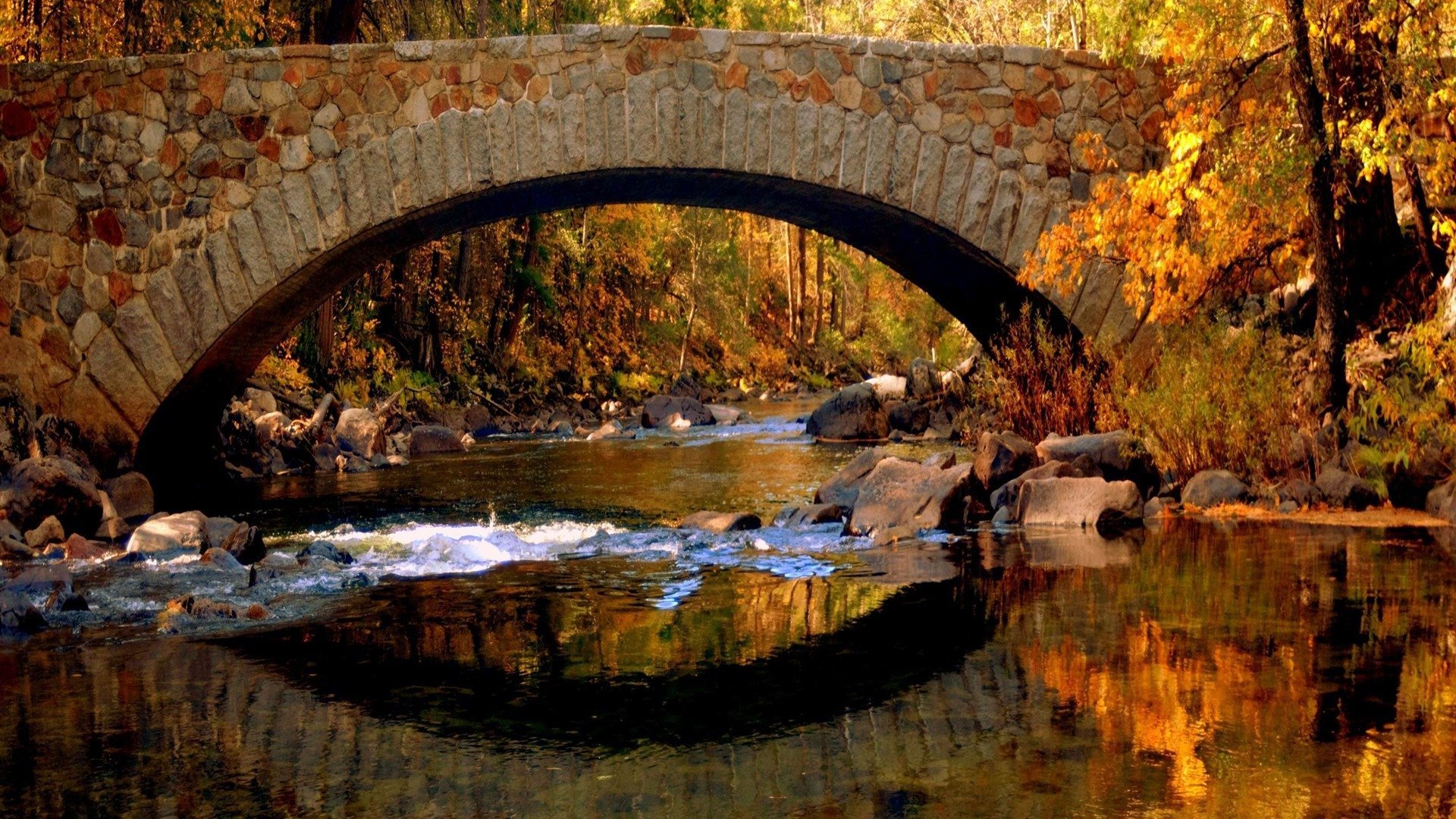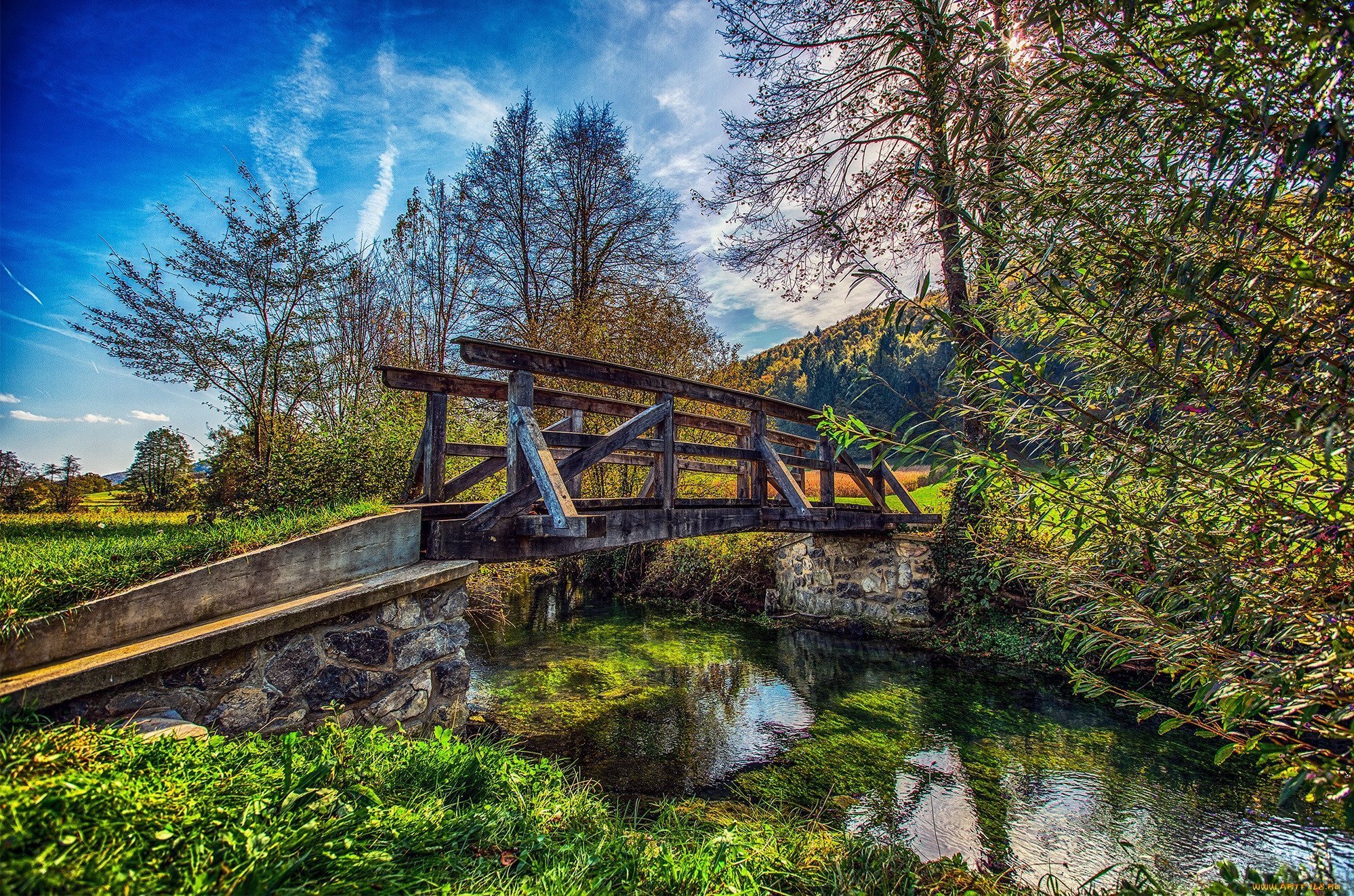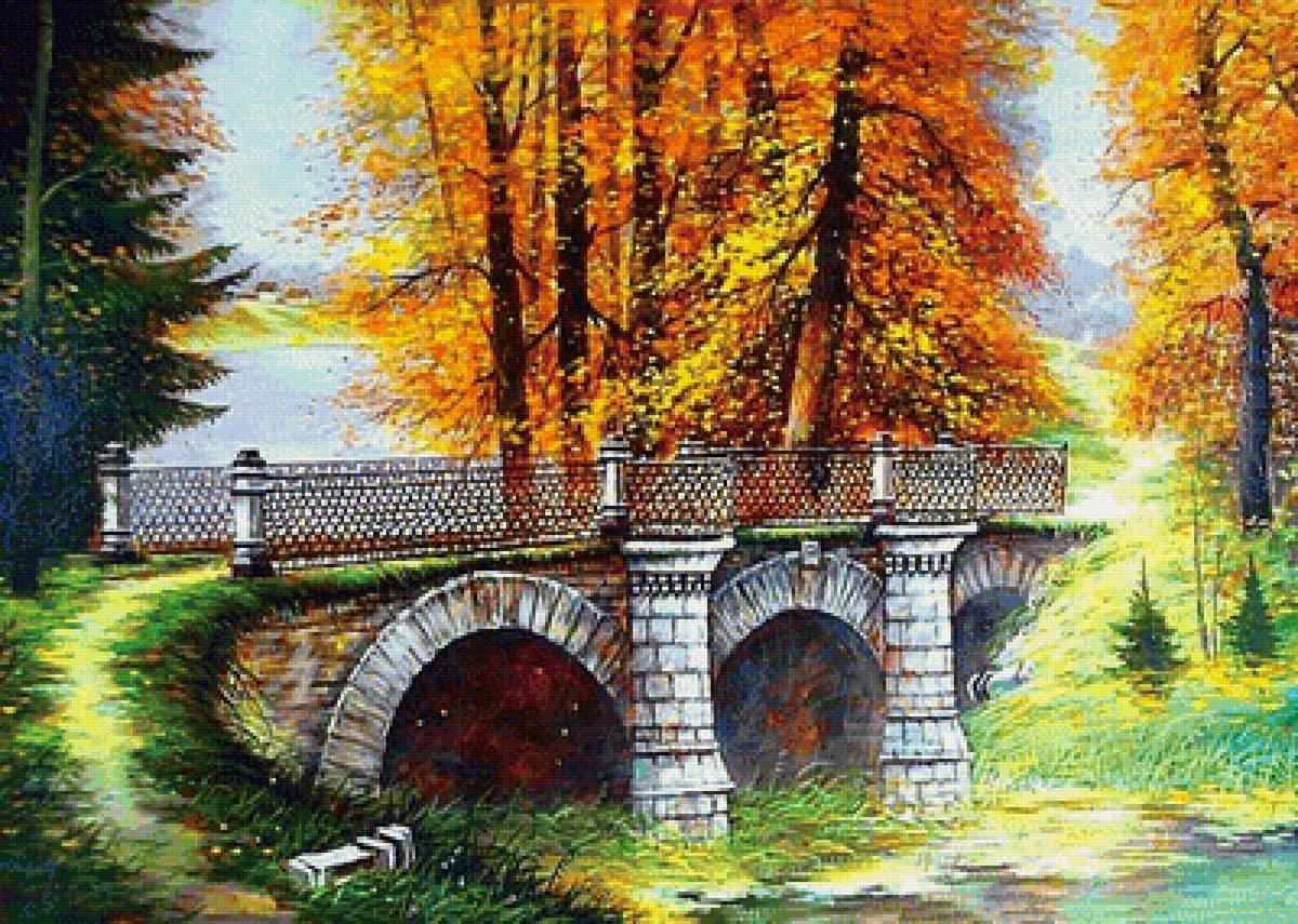 Представьте себе волшебный пейзаж с изящим мостом, который ласково простирается над тихой рекой. Величественные горы окружают его, создавая захватывающий фон для этой картины природы. Яркие цвета осени превращают деревья в пламенующую палитру, а золотистые листья, окутанные теплым солнечным светом, плывут по реке, словно медленные танцоры. Мягкий ветер шепчет тайны и мечты, делая пейзаж еще более загадочным и привлекательным. Это идеальное место для отдыха и вдохновения, где можно забыть о повседневных заботах и погрузиться в мир красоты и спокойствия.
