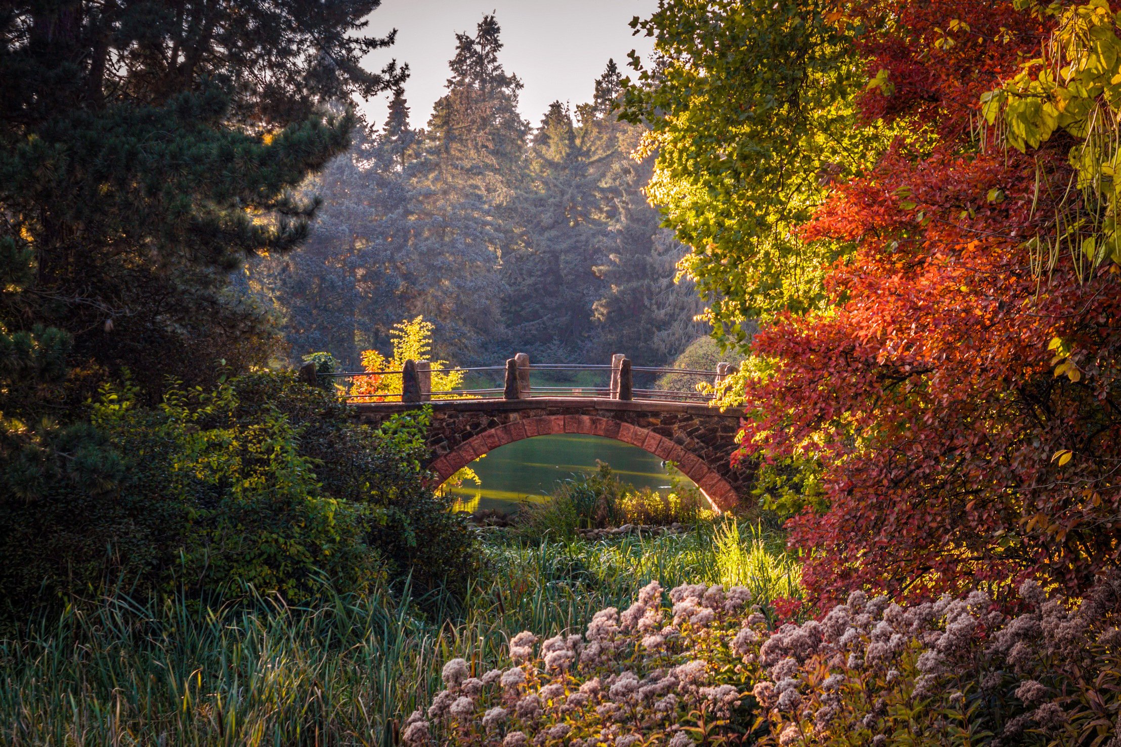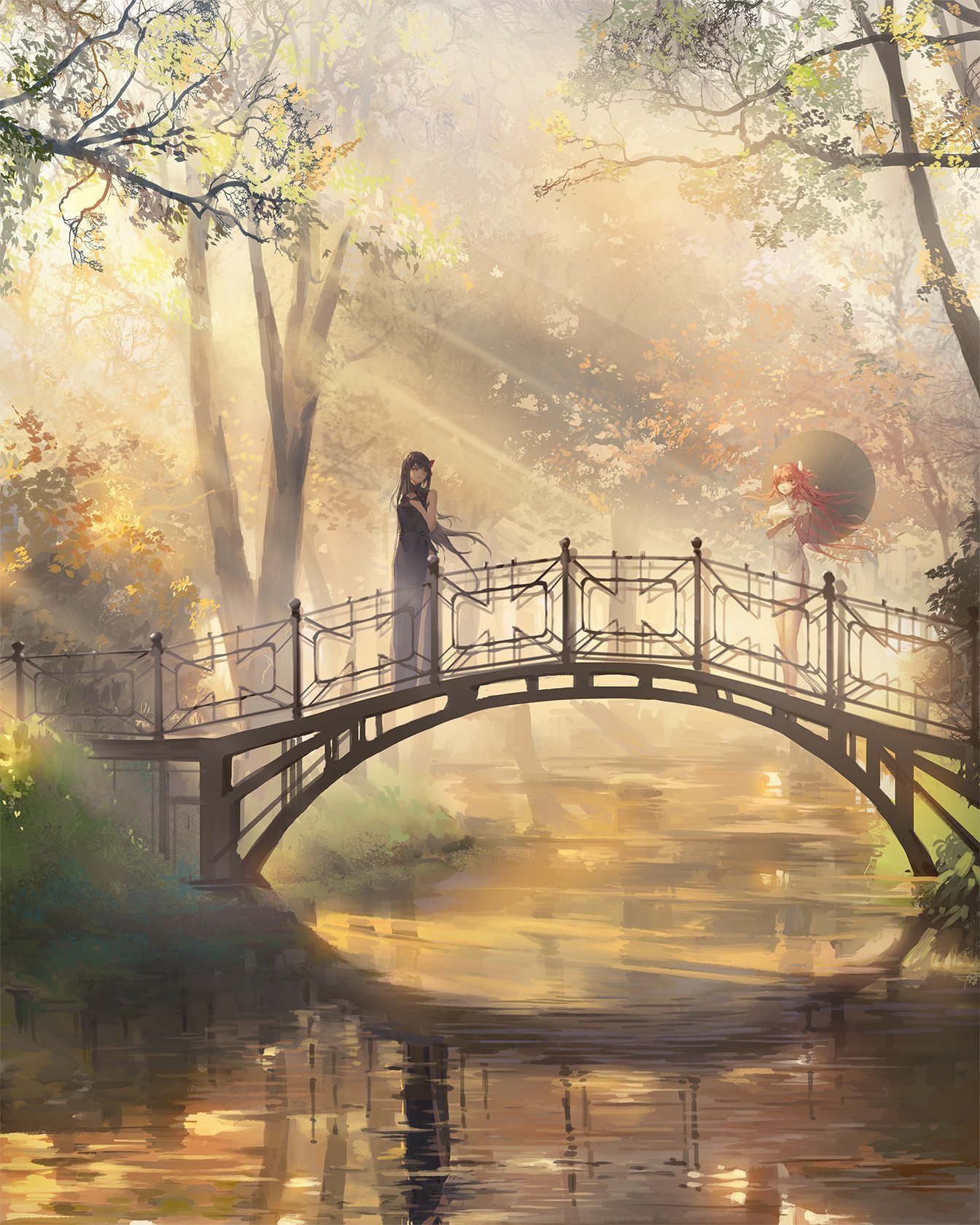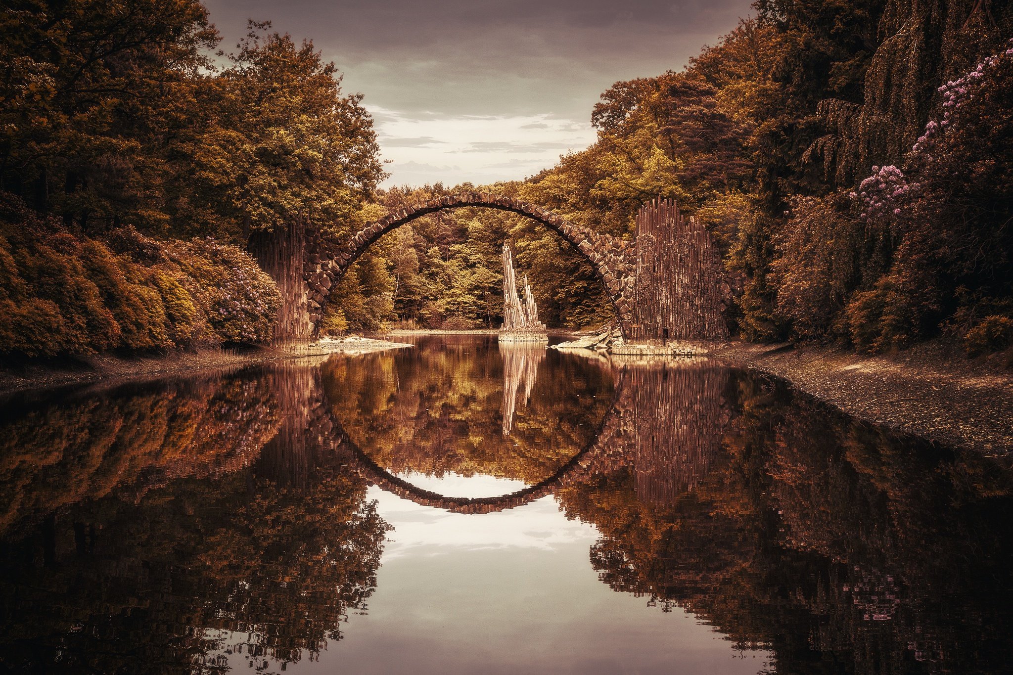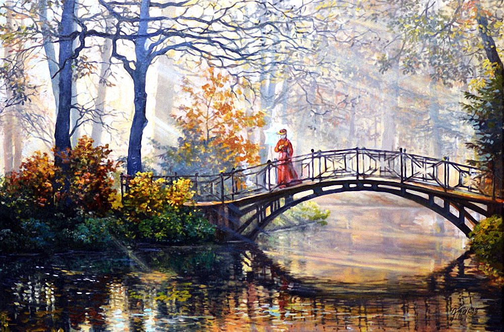 Представьте себе волшебный пейзаж с изящим мостом, который ласково простирается над тихой рекой. Величественные горы окружают его, создавая захватывающий фон для этой картины природы. Яркие цвета осени превращают деревья в пламенующую палитру, а золотистые листья, окутанные теплым солнечным светом, плывут по реке, словно медленные танцоры. Мягкий ветер шепчет тайны и мечты, делая пейзаж еще более загадочным и привлекательным. Это идеальное место для отдыха и вдохновения, где можно забыть о повседневных заботах и погрузиться в мир красоты и спокойствия.