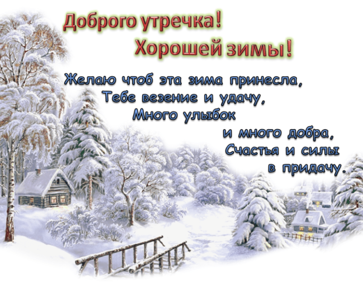 Доброе утро! Представь себе зимний пейзаж, где все вокруг покрыто белым пушистым снегом. Воздух пронизан свежестью и холодом, но при этом ощущается особая теплота и уют. Лазурное небо украшено яркими солнечными лучами, которые играют на снежных вершинах деревьев. Снеговики, созданные детскими руками, весело улыбаются и радуют глаз. Все вокруг напоминает о празднике и ожидании чуда. Именно такой зимний пейзаж я хочу подарить тебе с этим добрым утром. Пусть каждый день начинается с теплых эмоций и радостных мгновений, а зимняя красота будет твоим надежным спутником. Доброго утра!