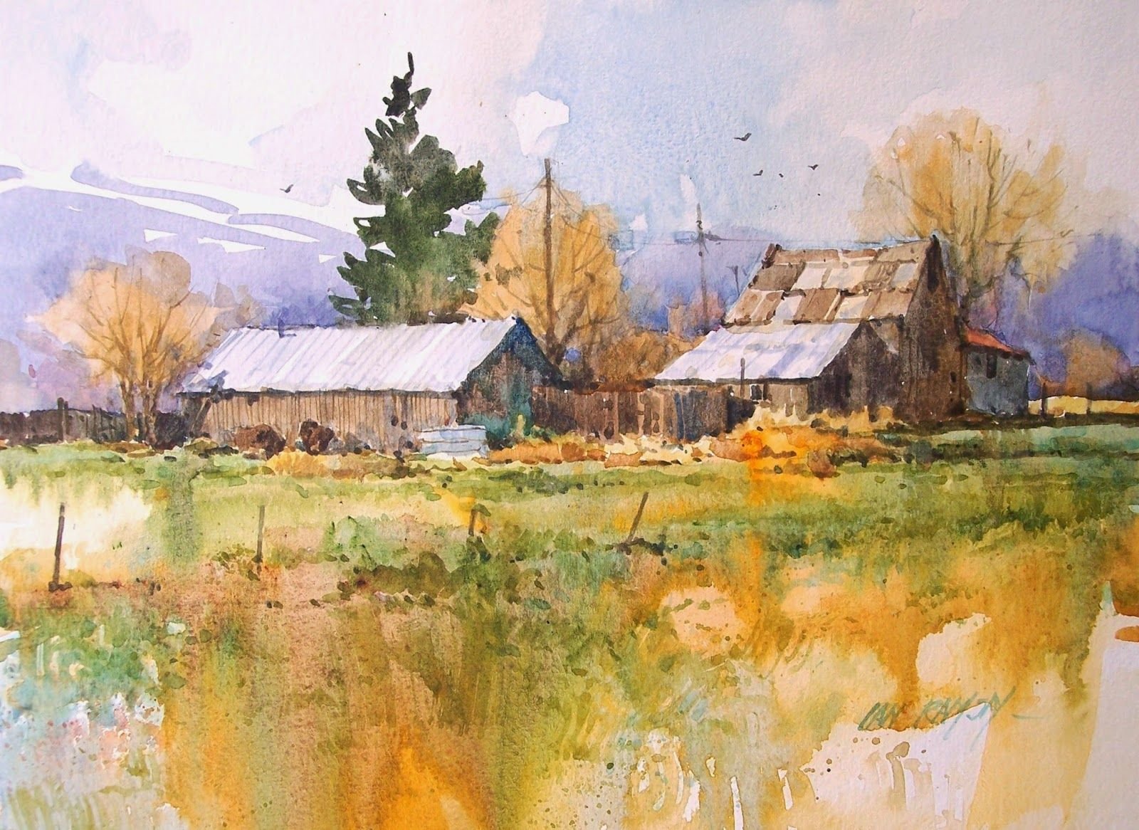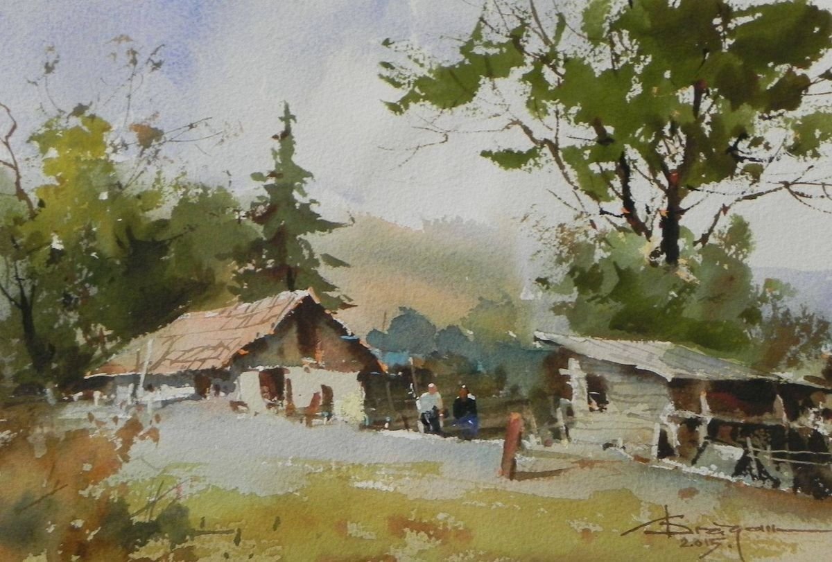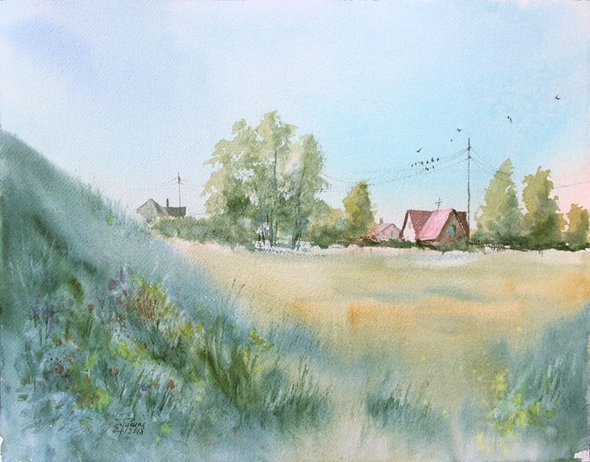 Сельский пейзаж акварелью