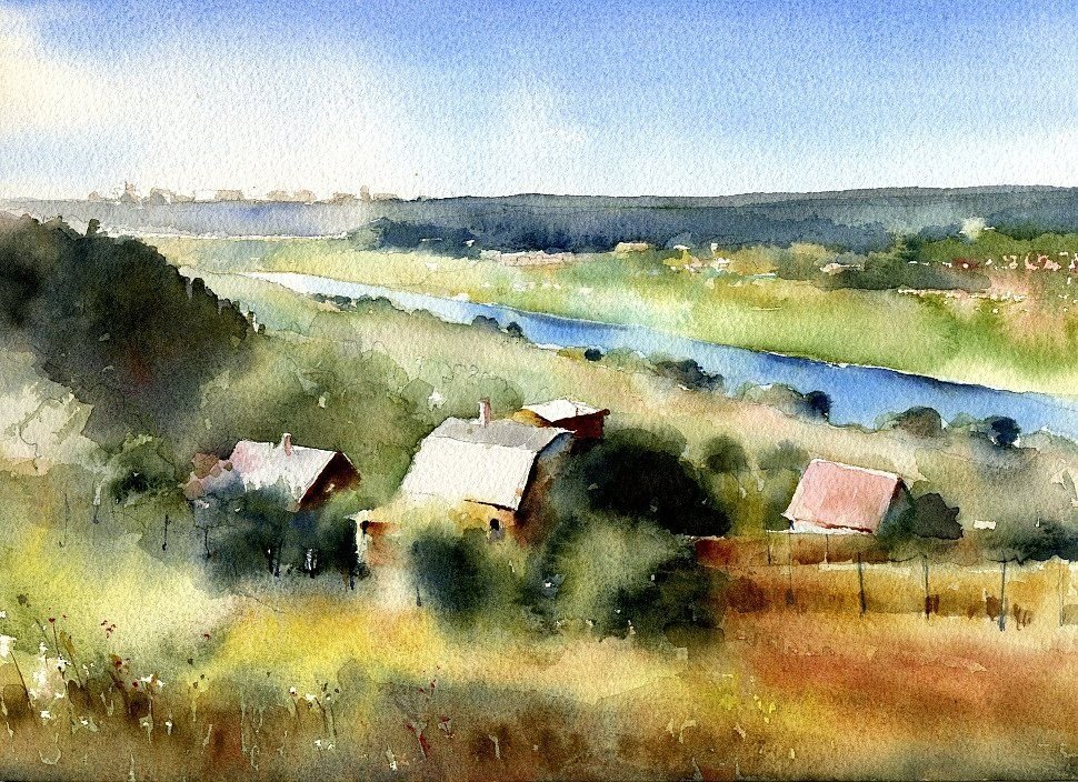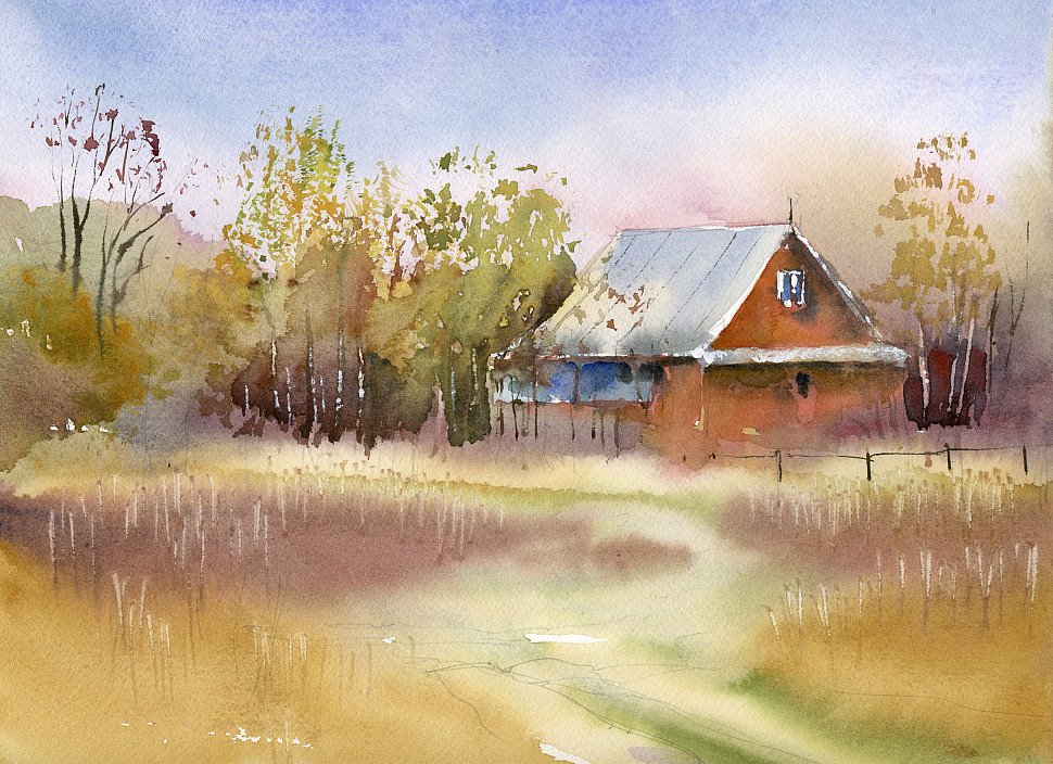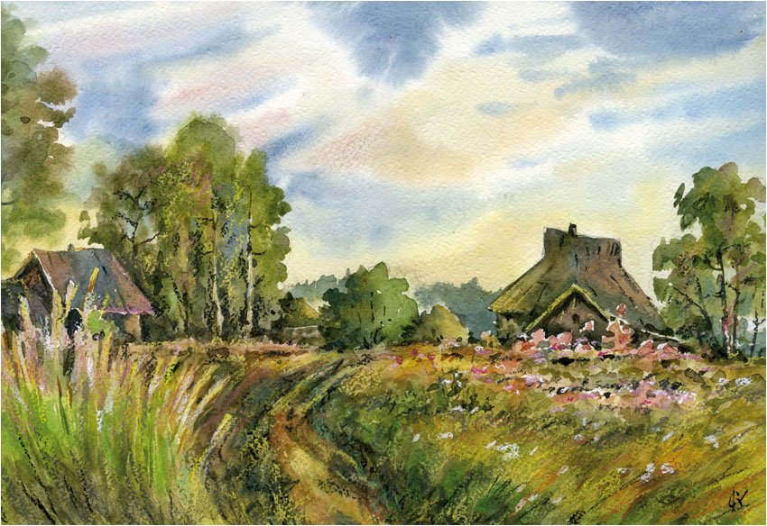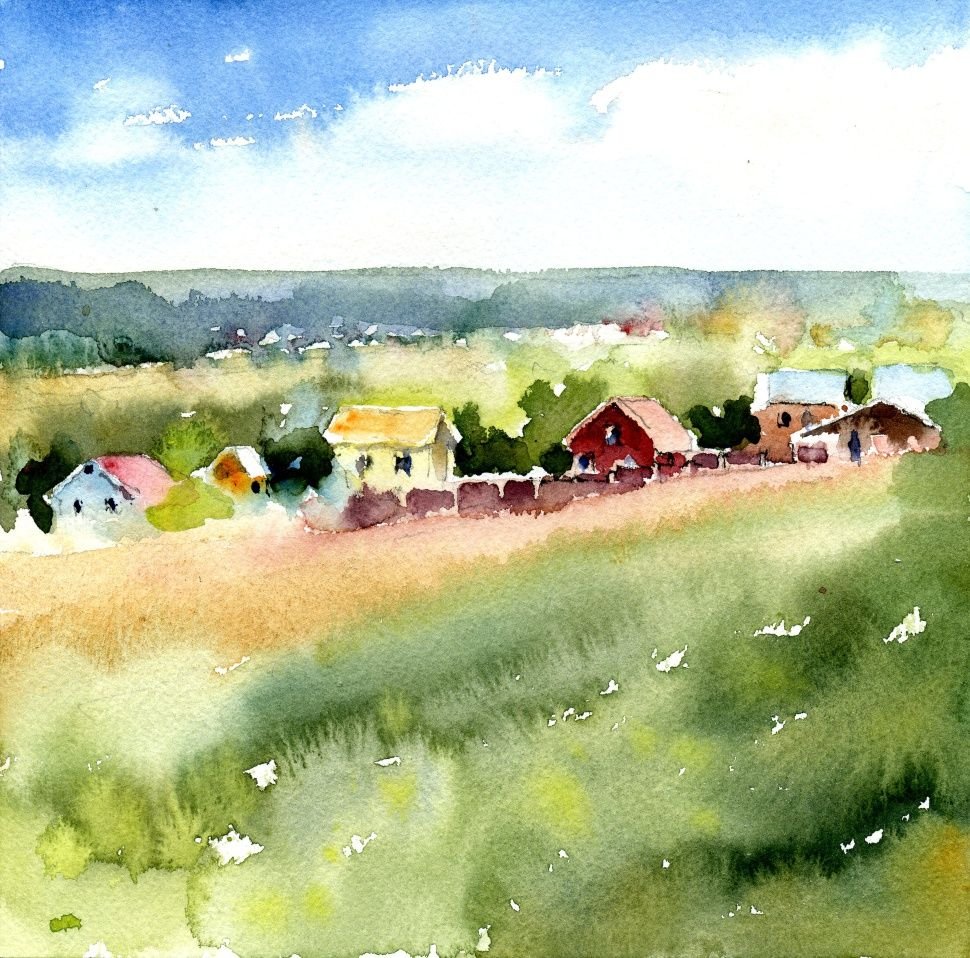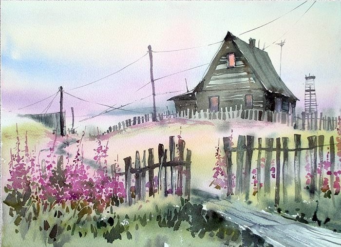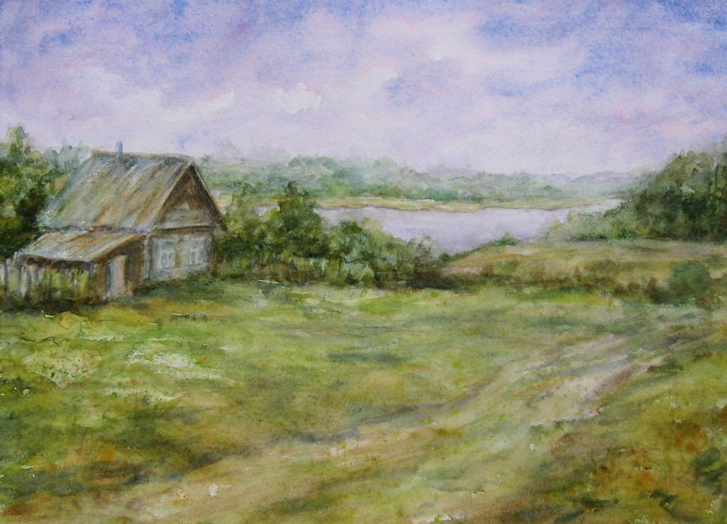 Деревенский пейзаж акварелью