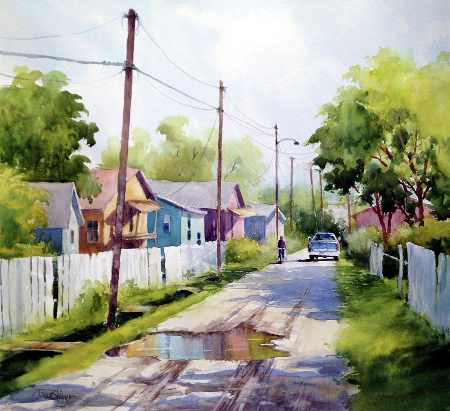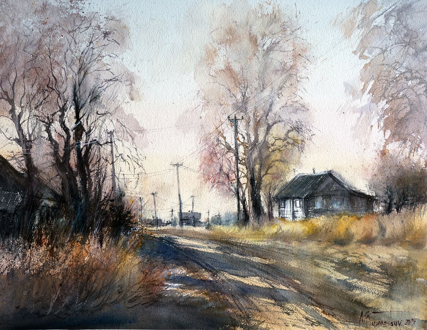 Этюд сельской улицы акварелью