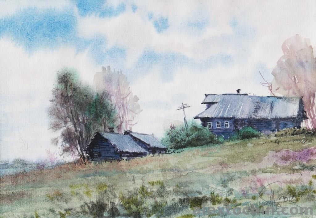 Этюд акварель пейзаж село деревня