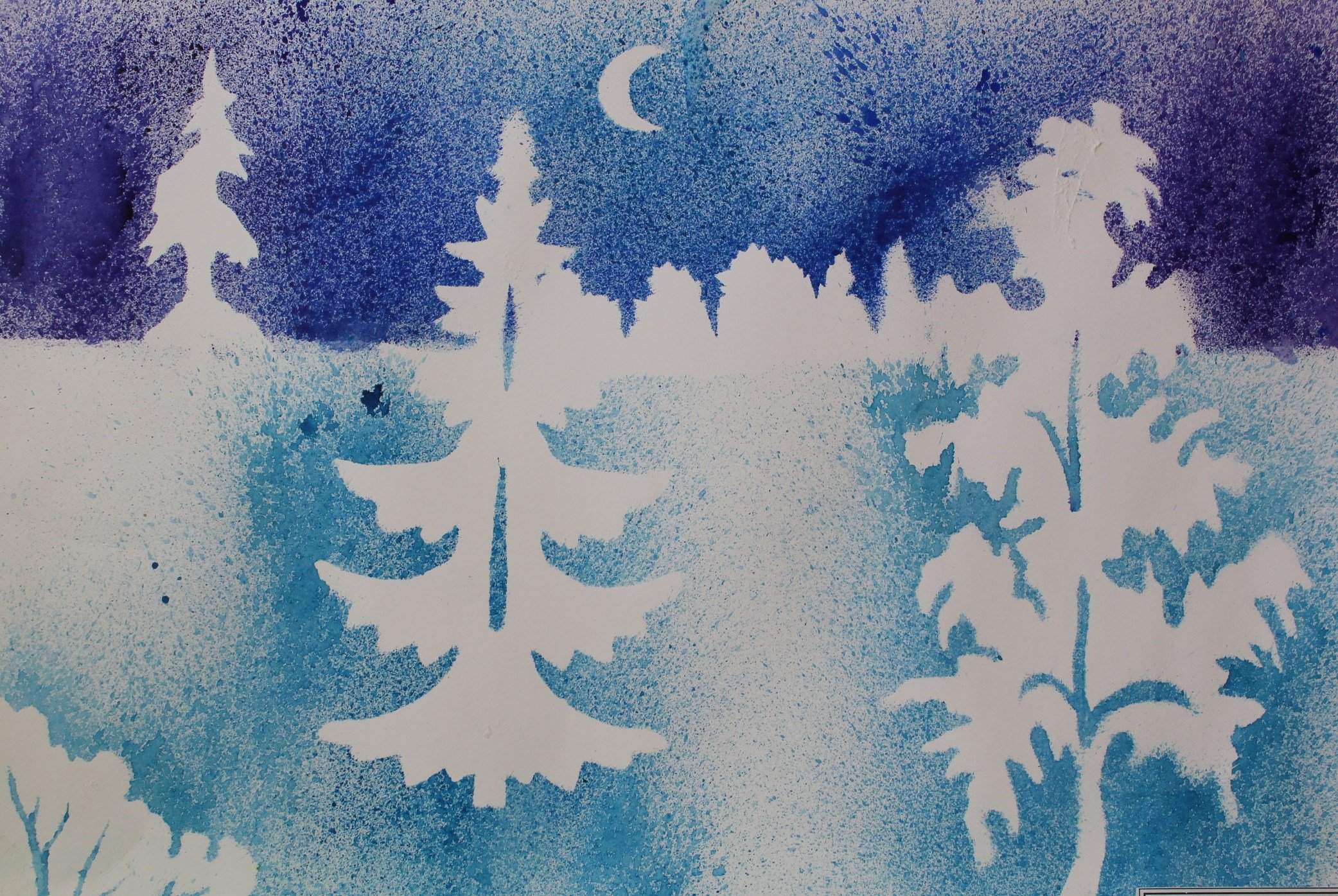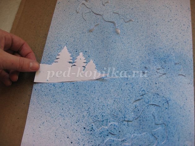 Рисование в технике набрызг зимний лес