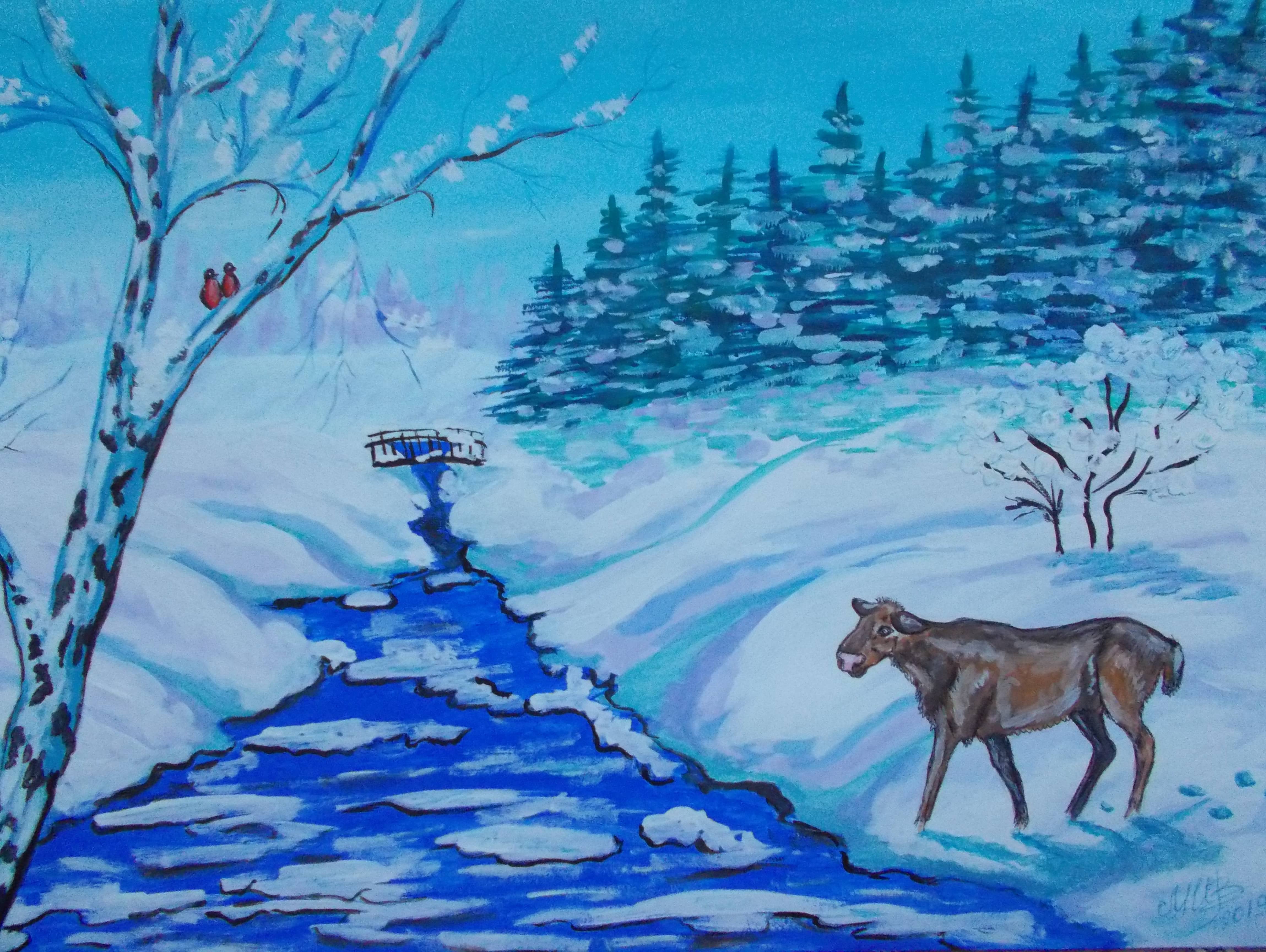 Зимний пейзаж рисунок гуашью