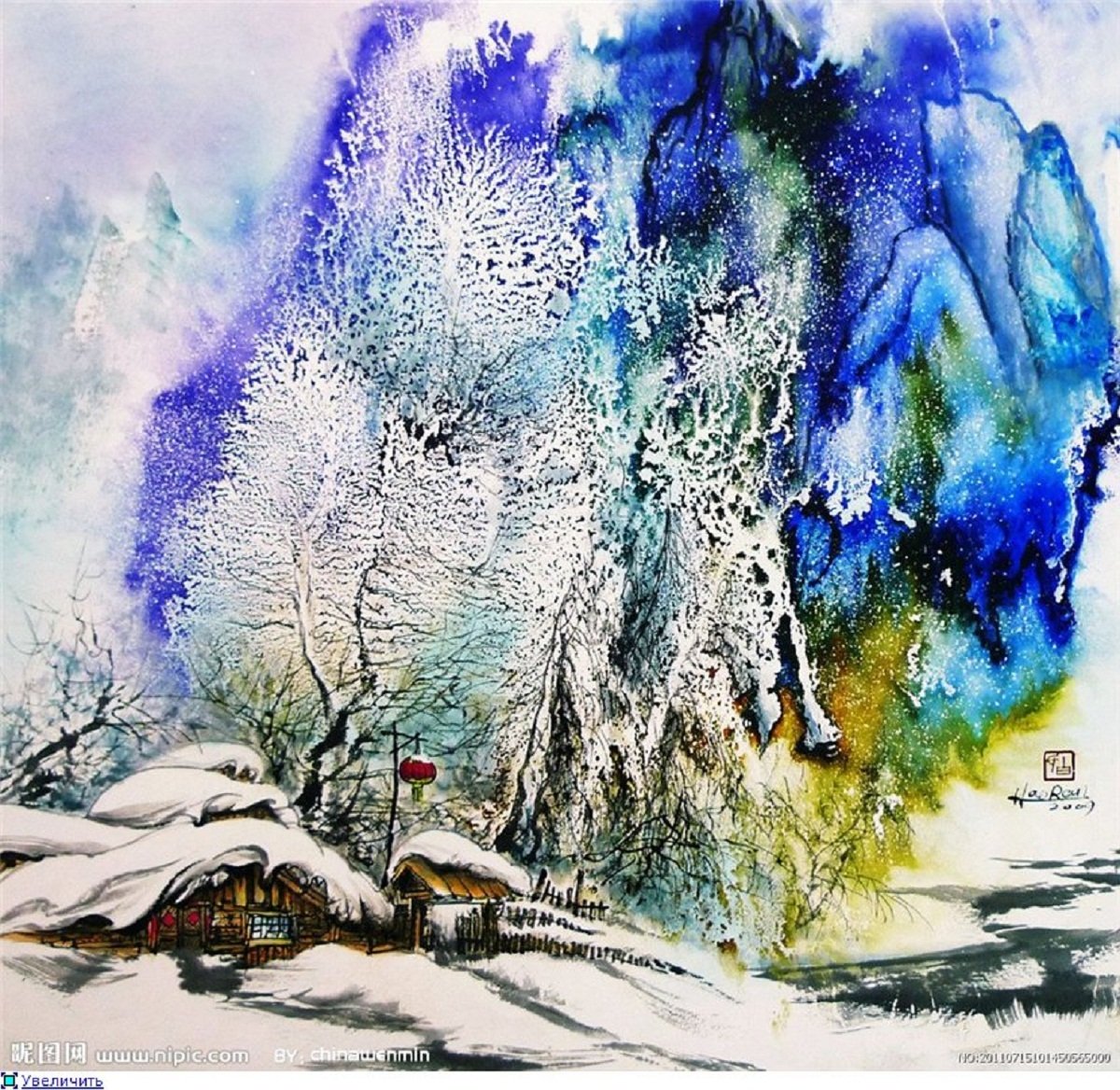 Зимний пейзаж с домиком акварелью