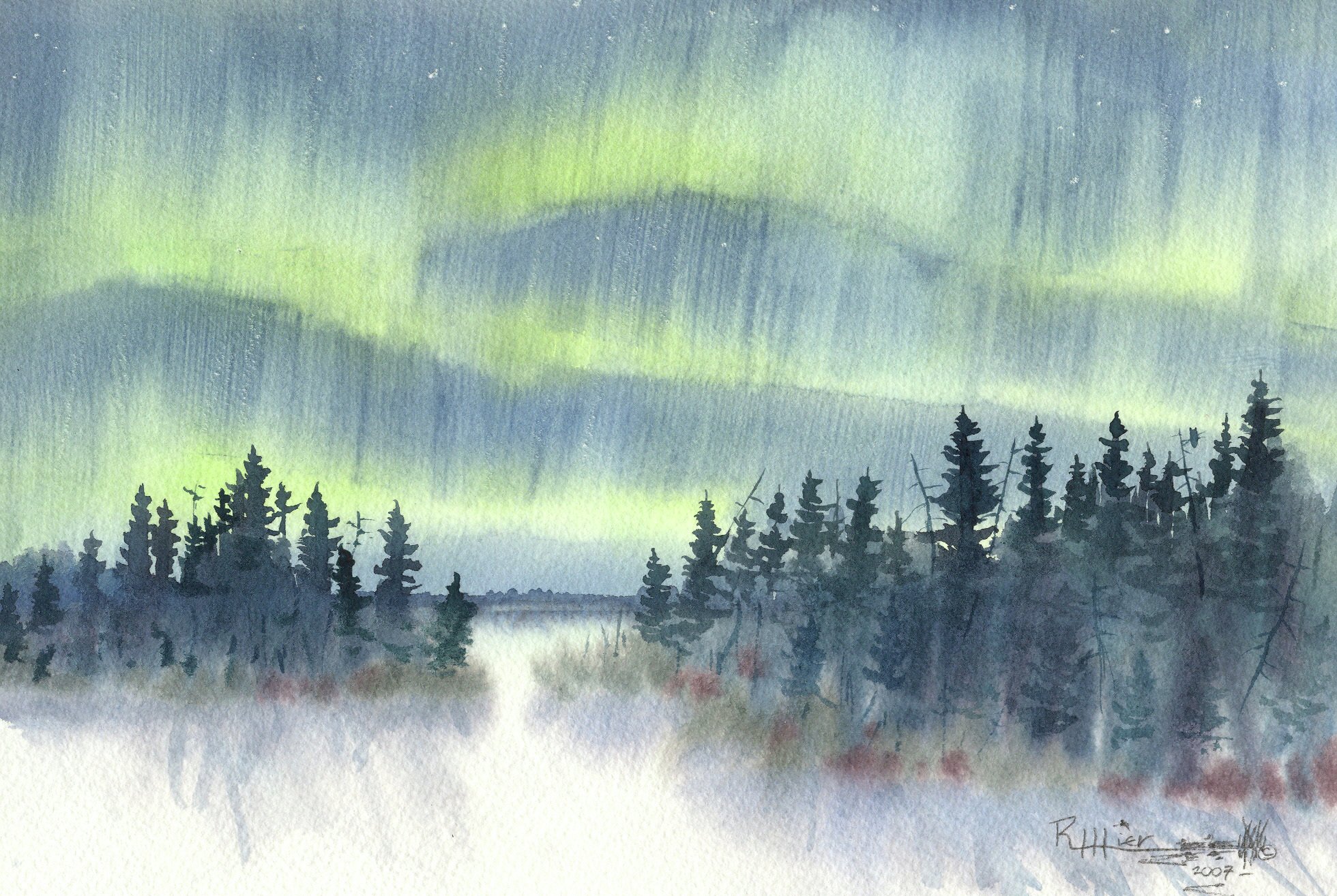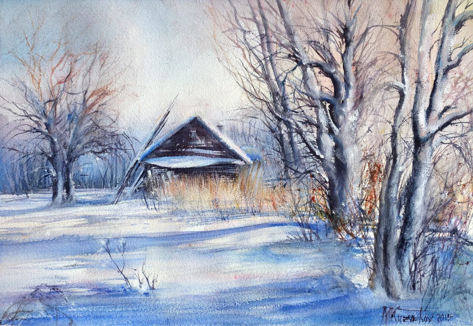 Зимний пейзаж акварелью поэтапно