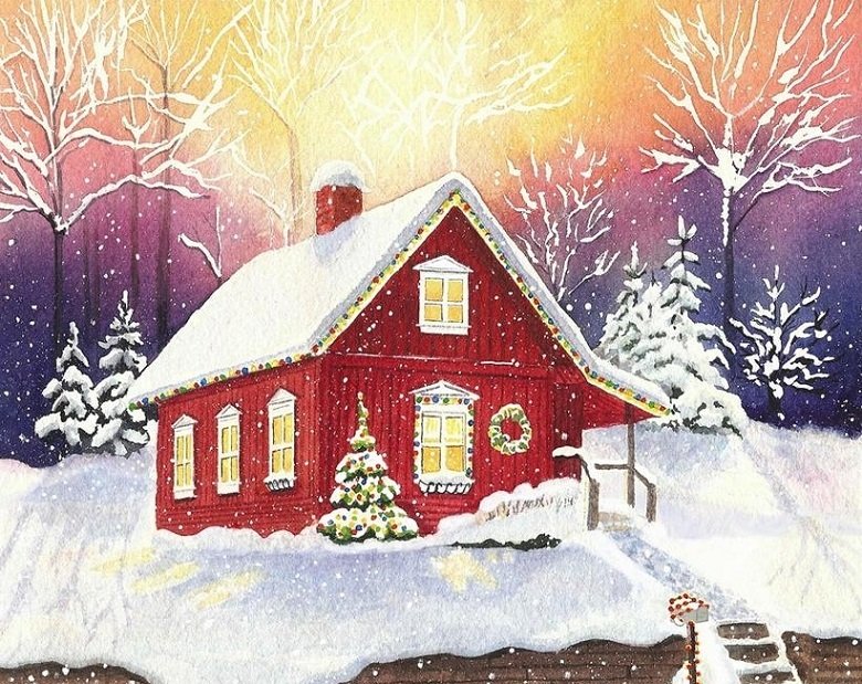 Зимний пейзаж с домиком акварелью