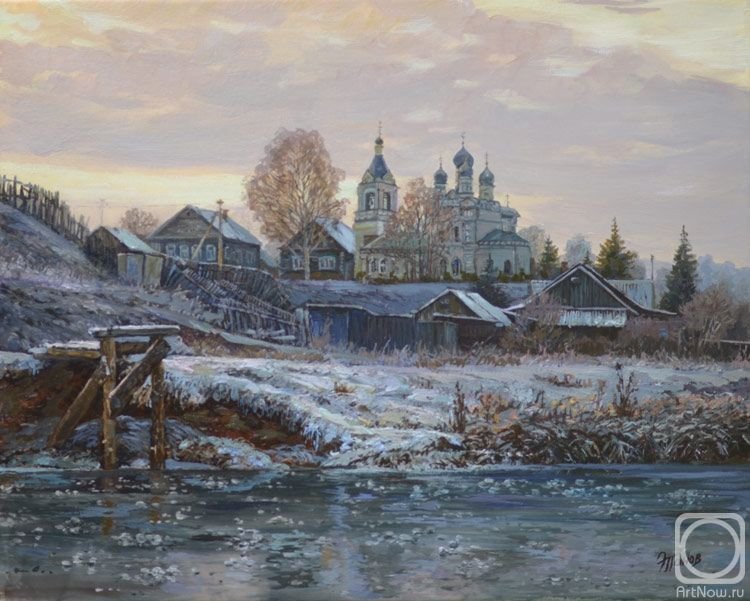 Зимняя деревня церквушка картина Эдуард Панов