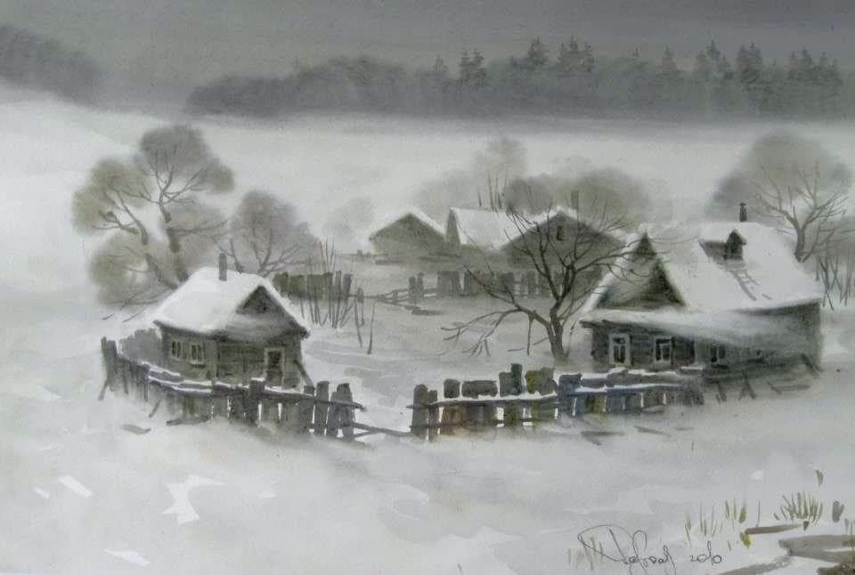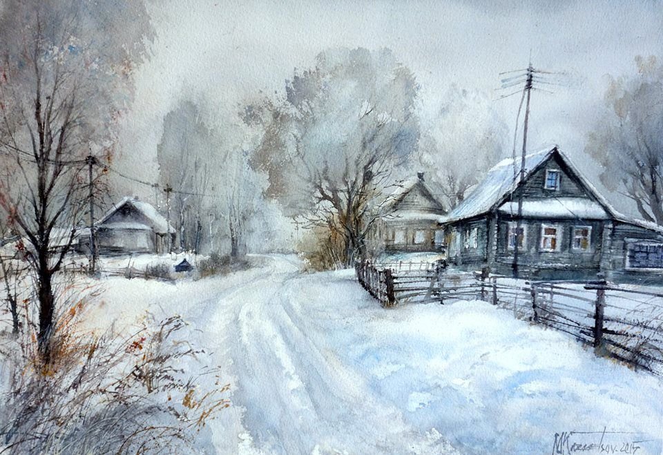 Акварель художника Коростылева зимние Деревенские пейзажи