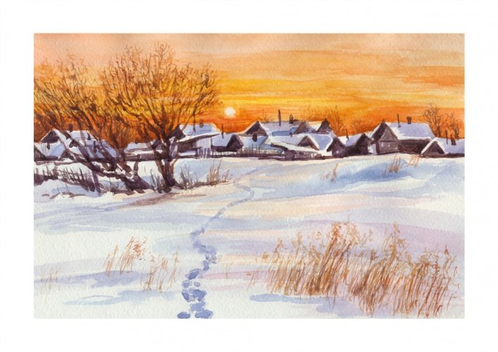 Акварель деревня зимой