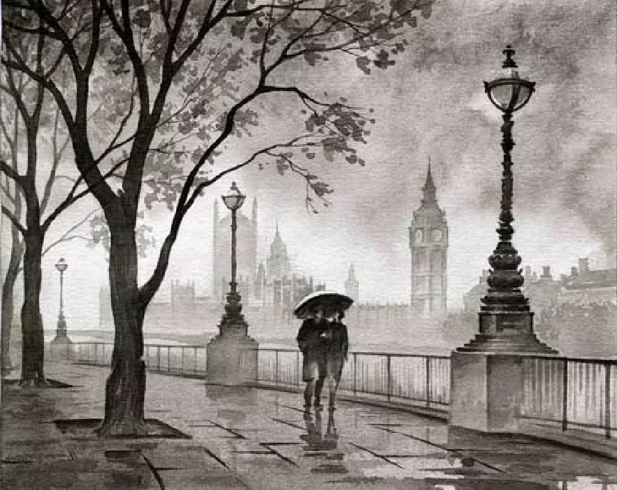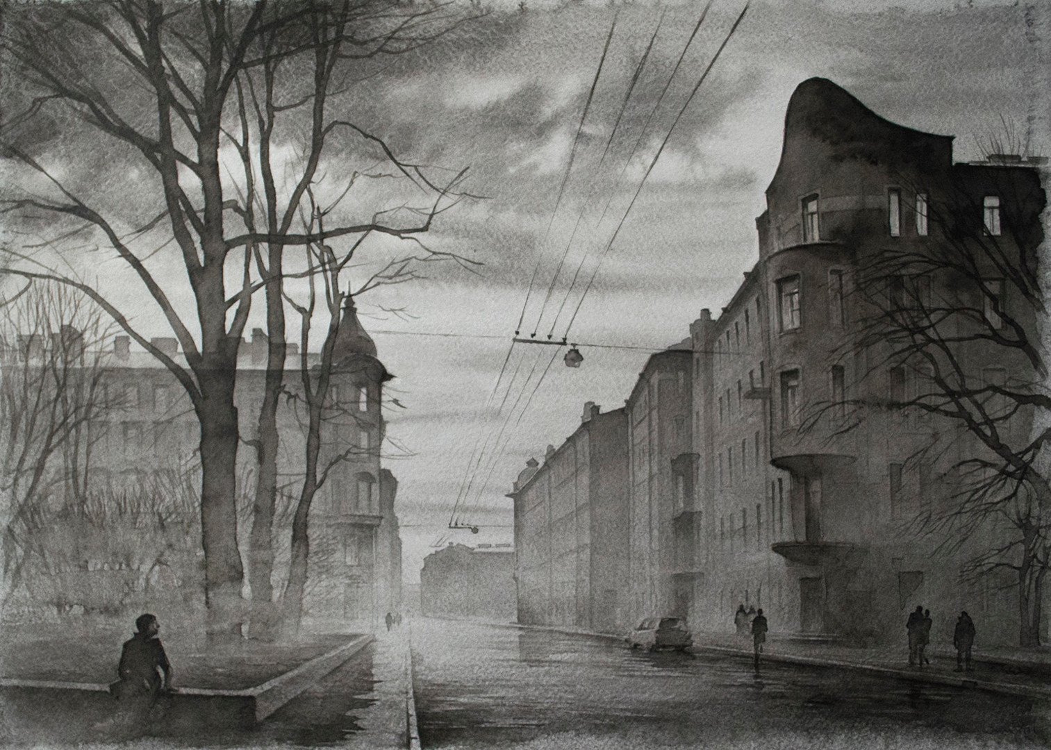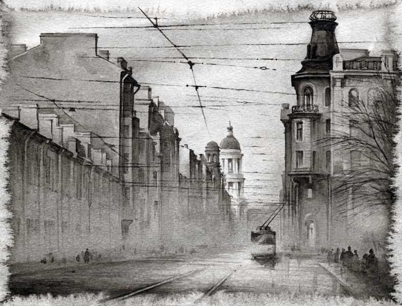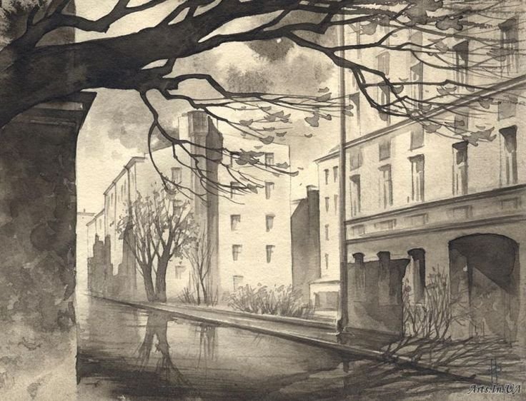 Гризайль акварелью городской пейзаж