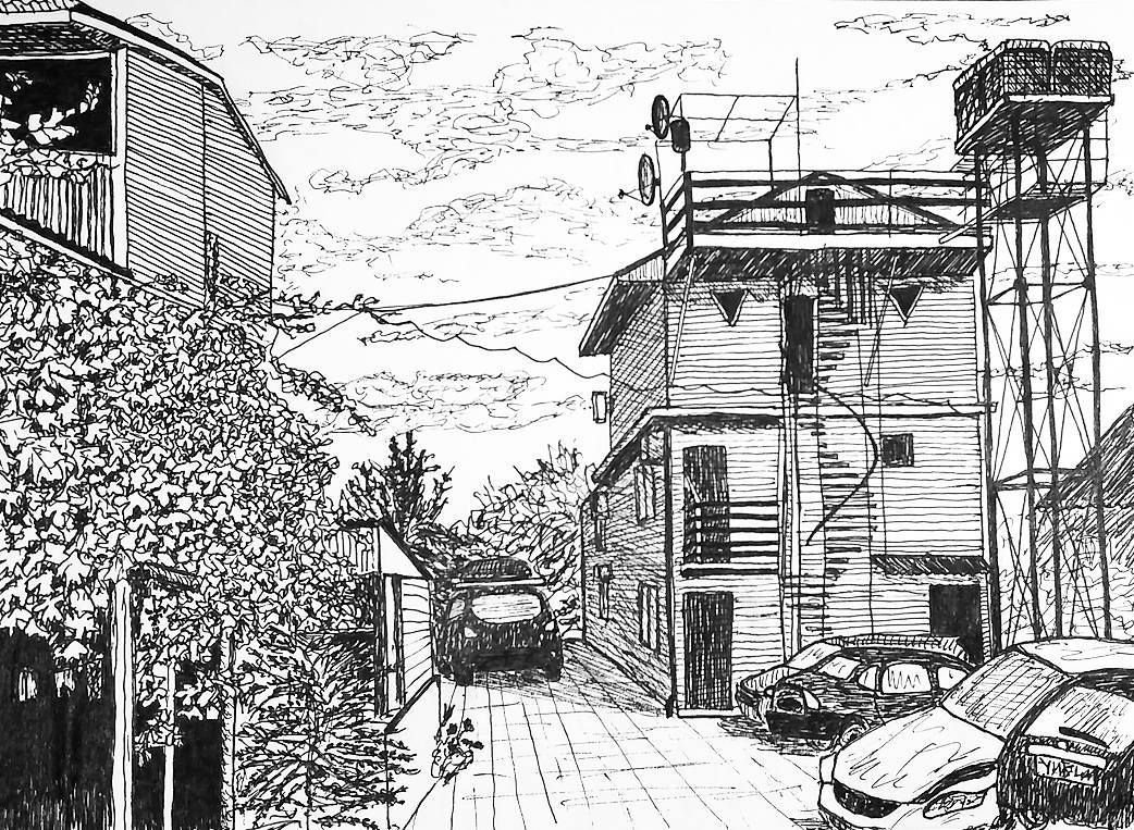 Городской пейзаж гелевой ручкой