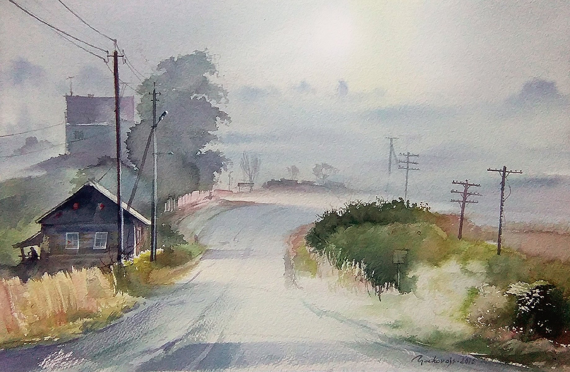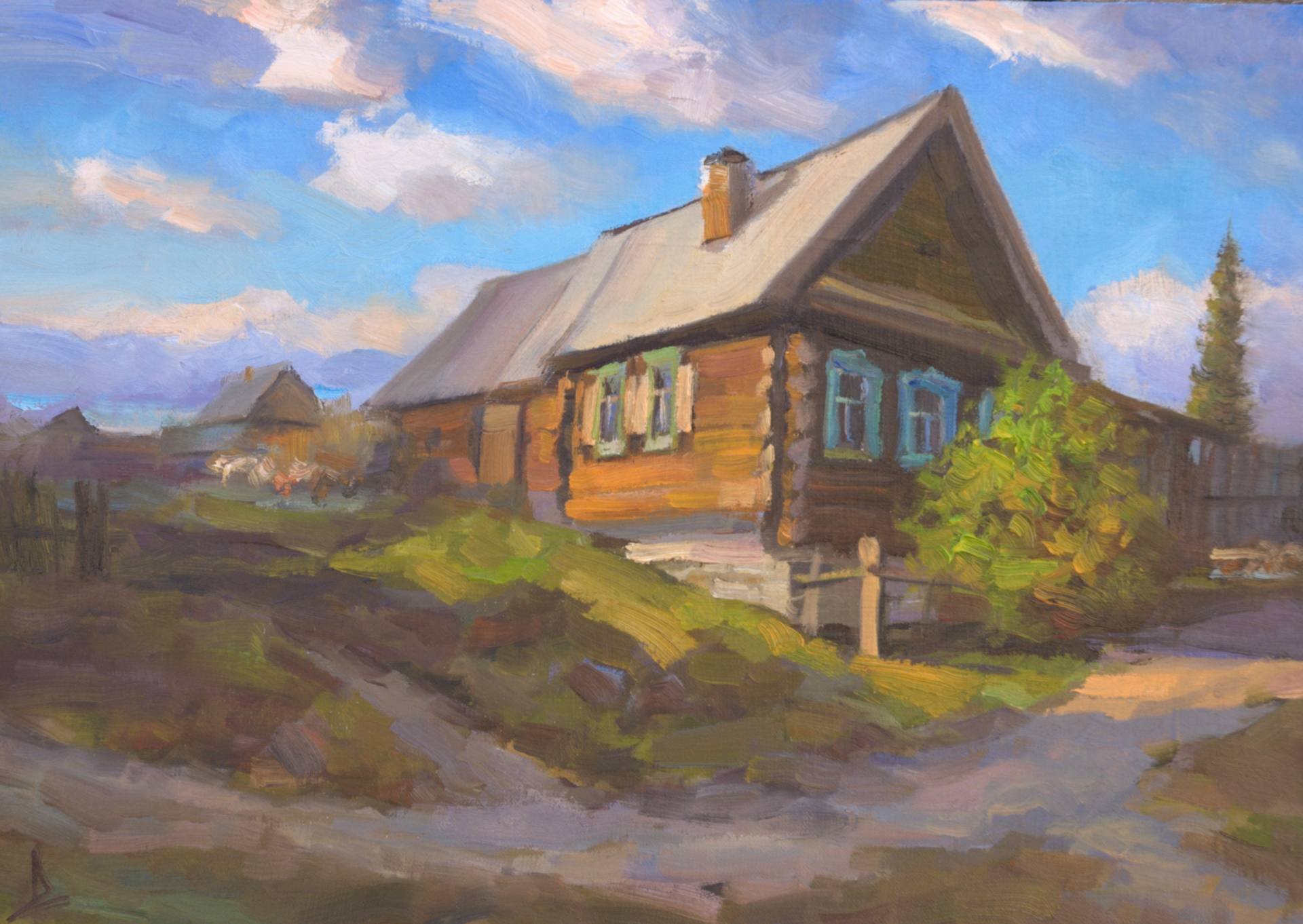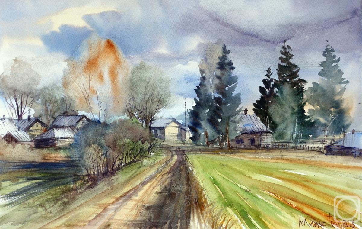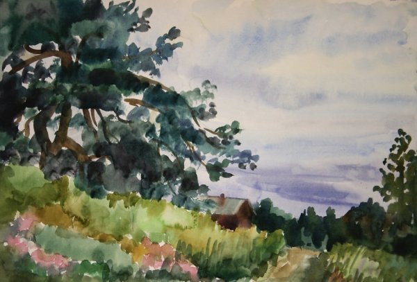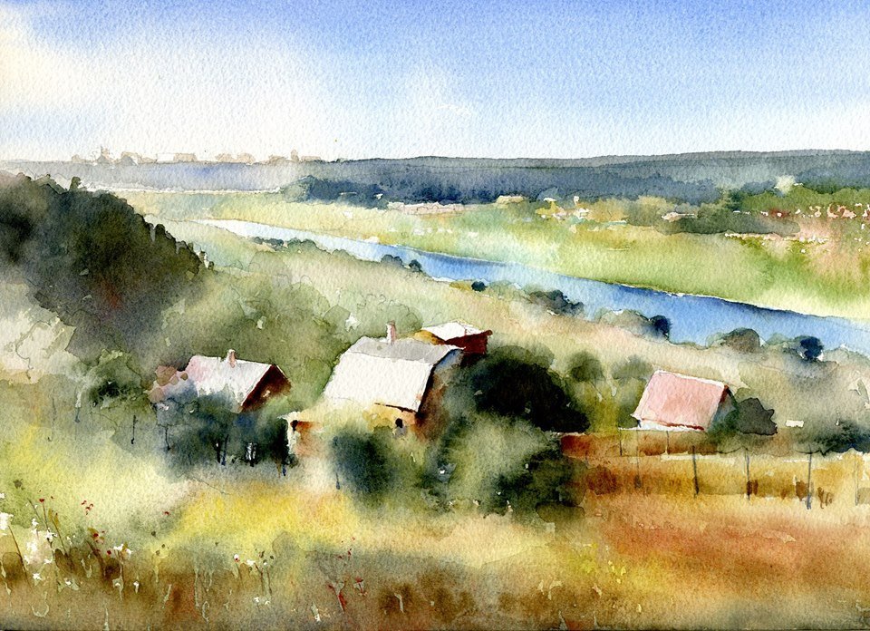 Деревенский пейзаж акварелью