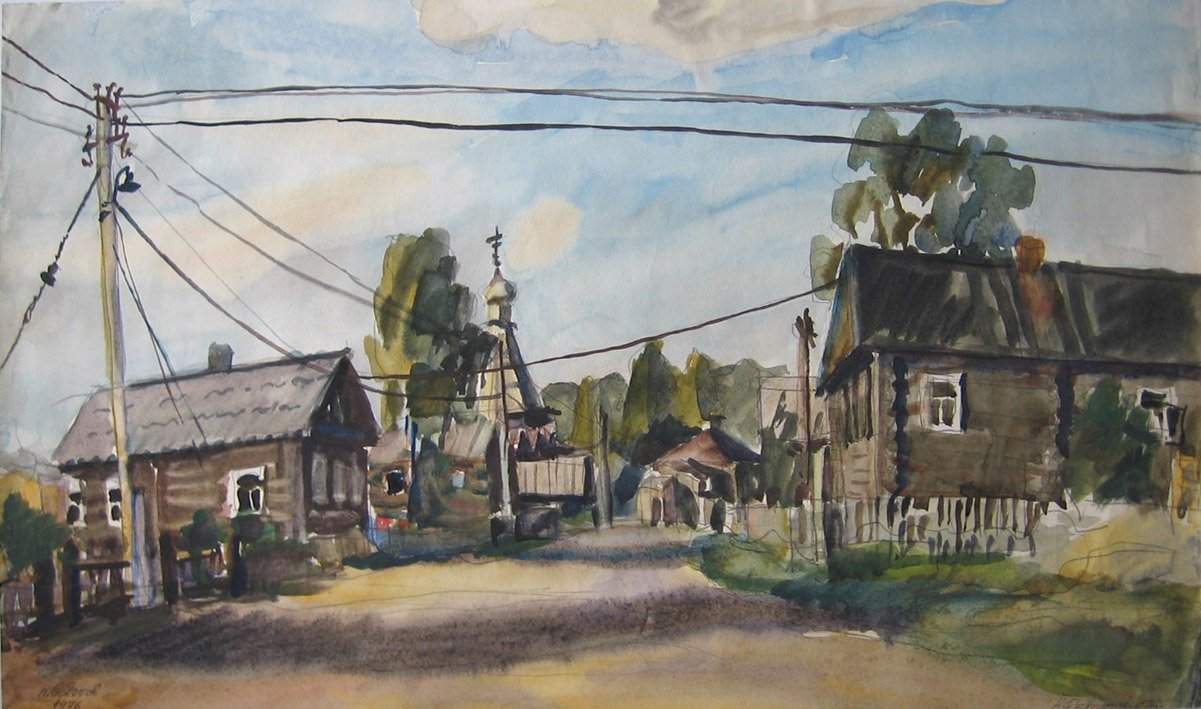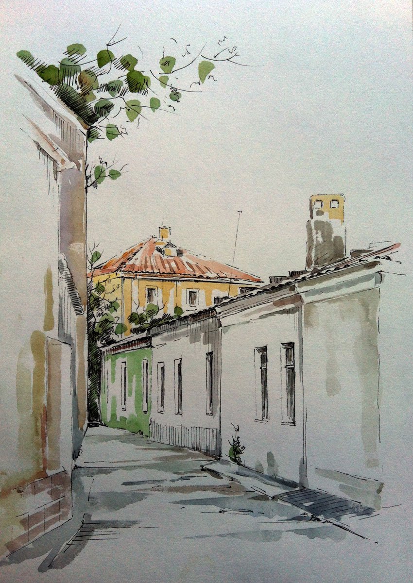 Этюд сельской улицы акварелью