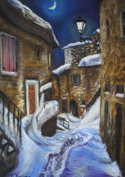 Городской зимний пейзаж пастелью