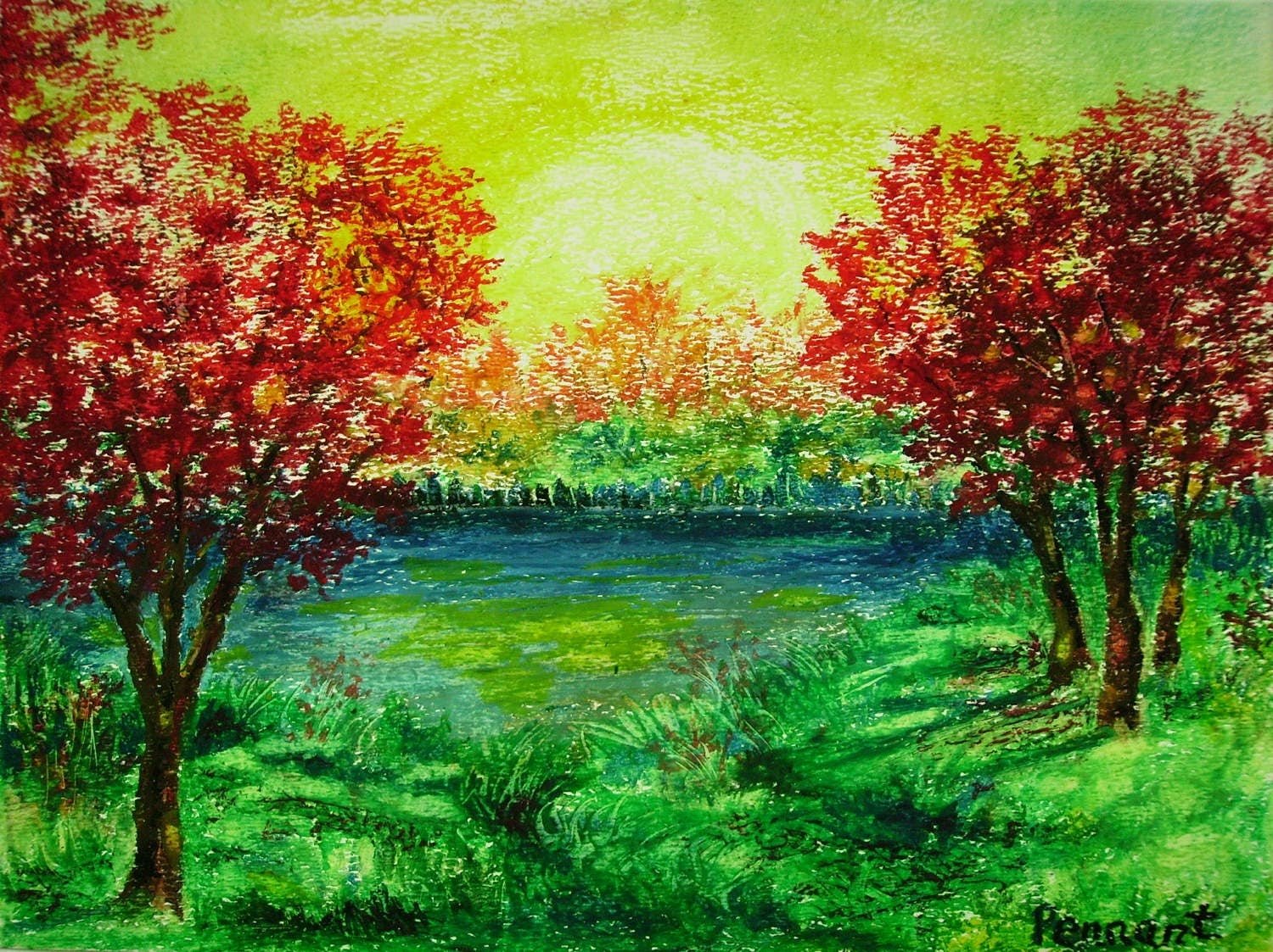 Пейзаж осени цветными карандашами