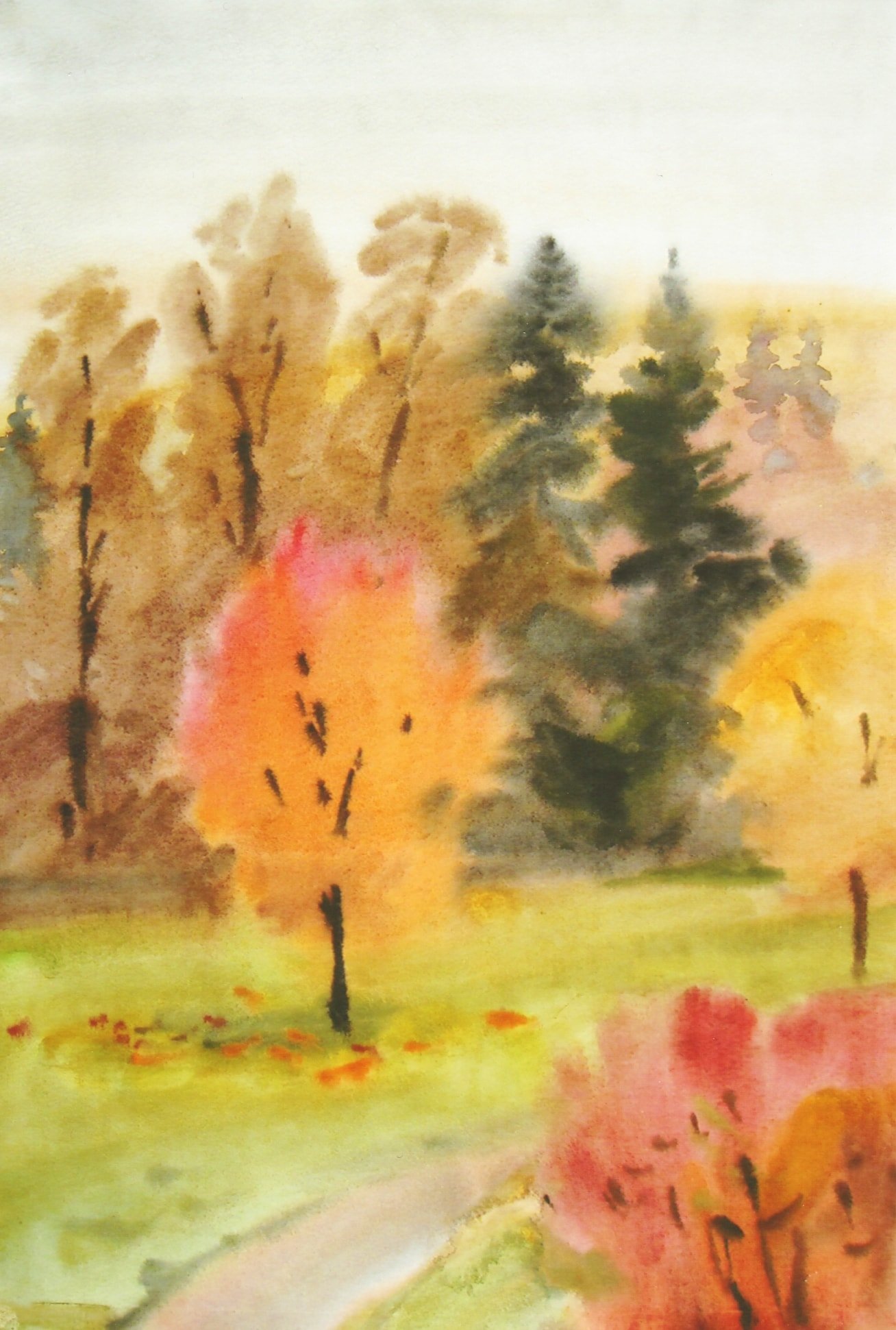 Осенний пейзаж акварелью по сырому