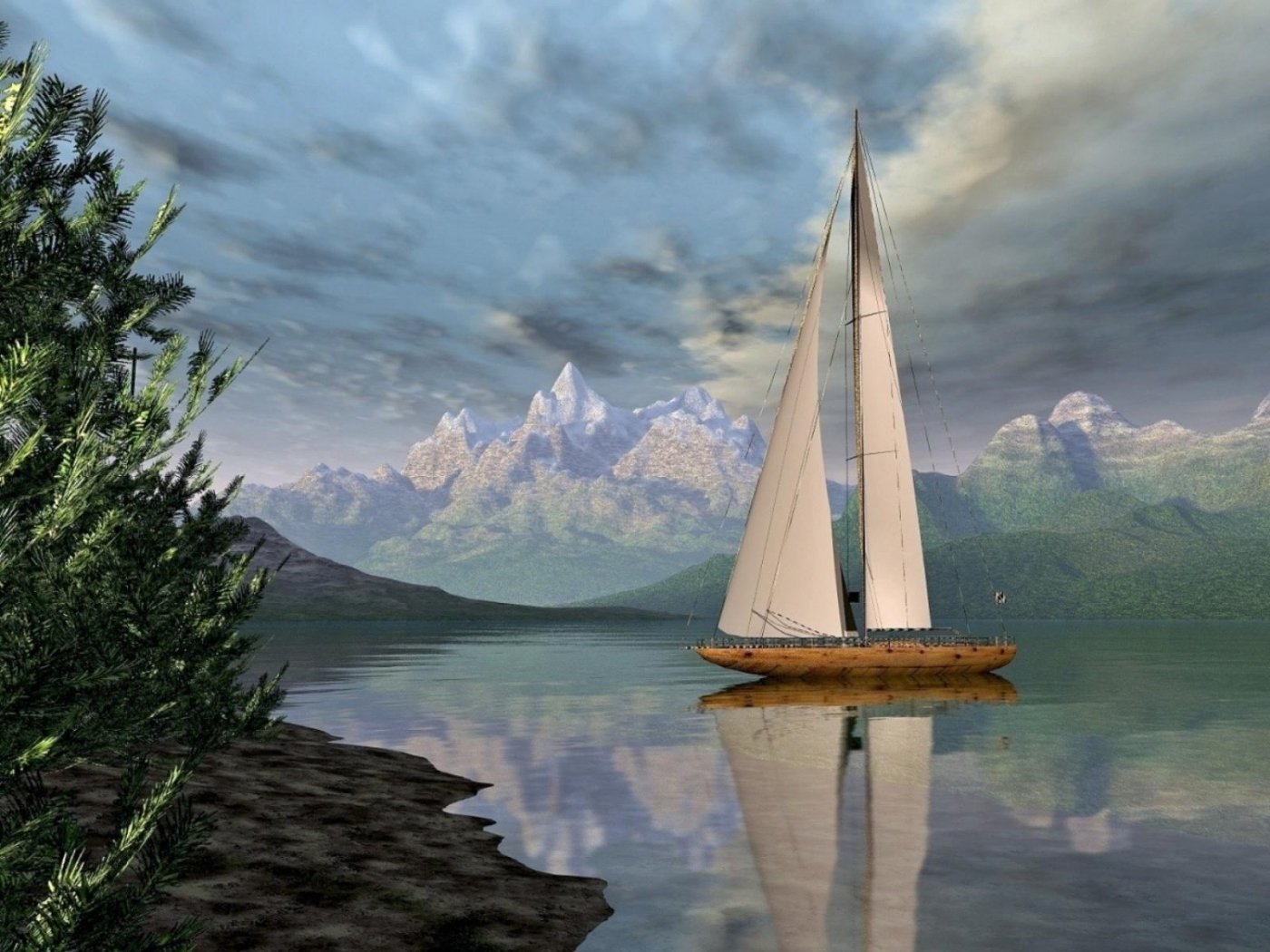 Море парусник горы