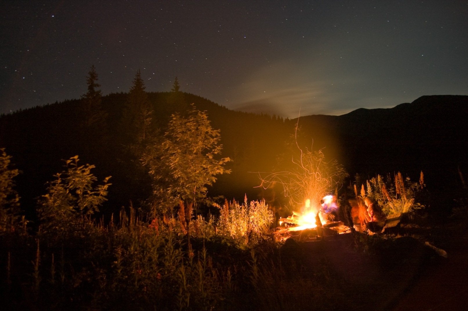 Костер в горах ночью