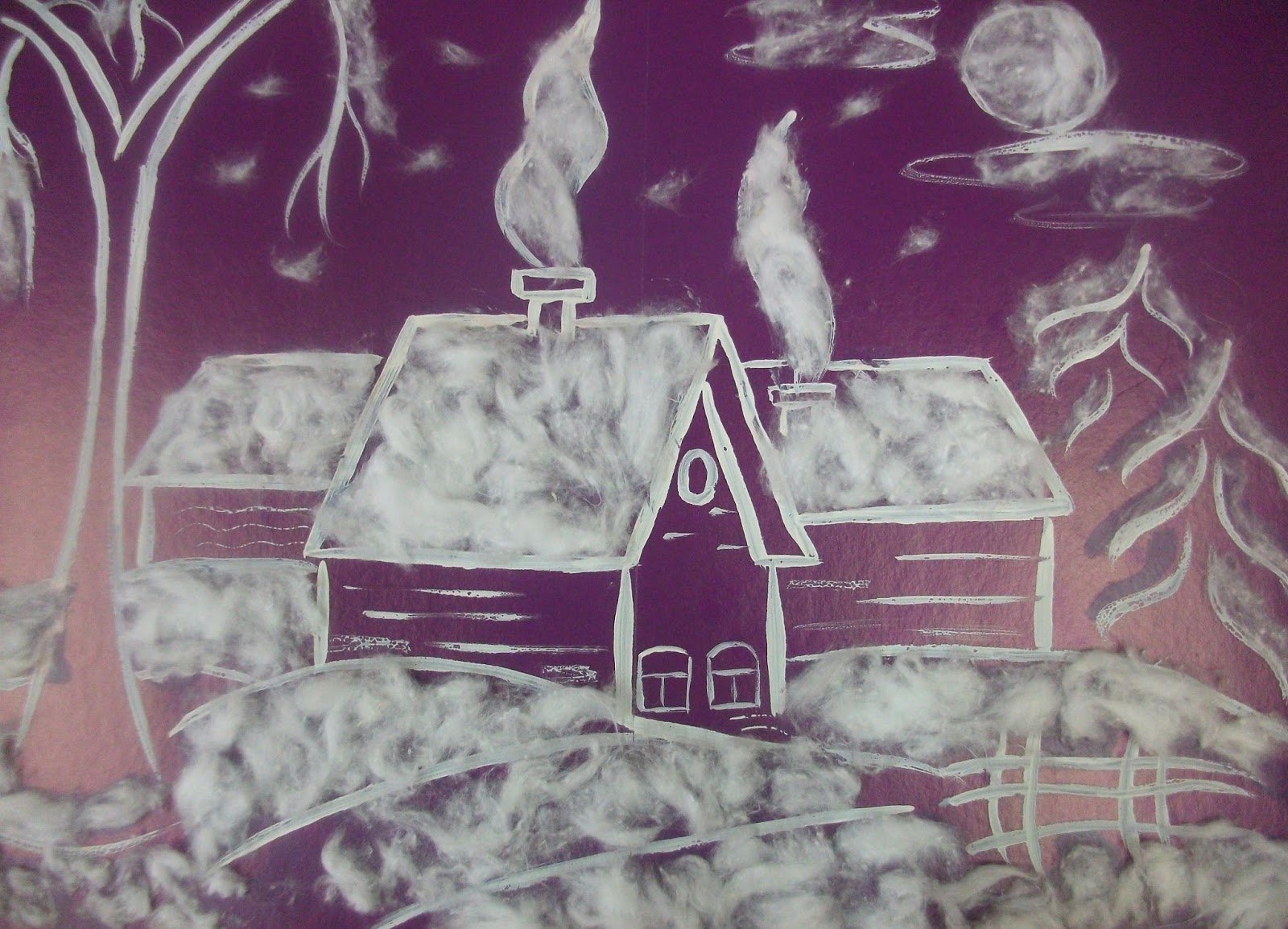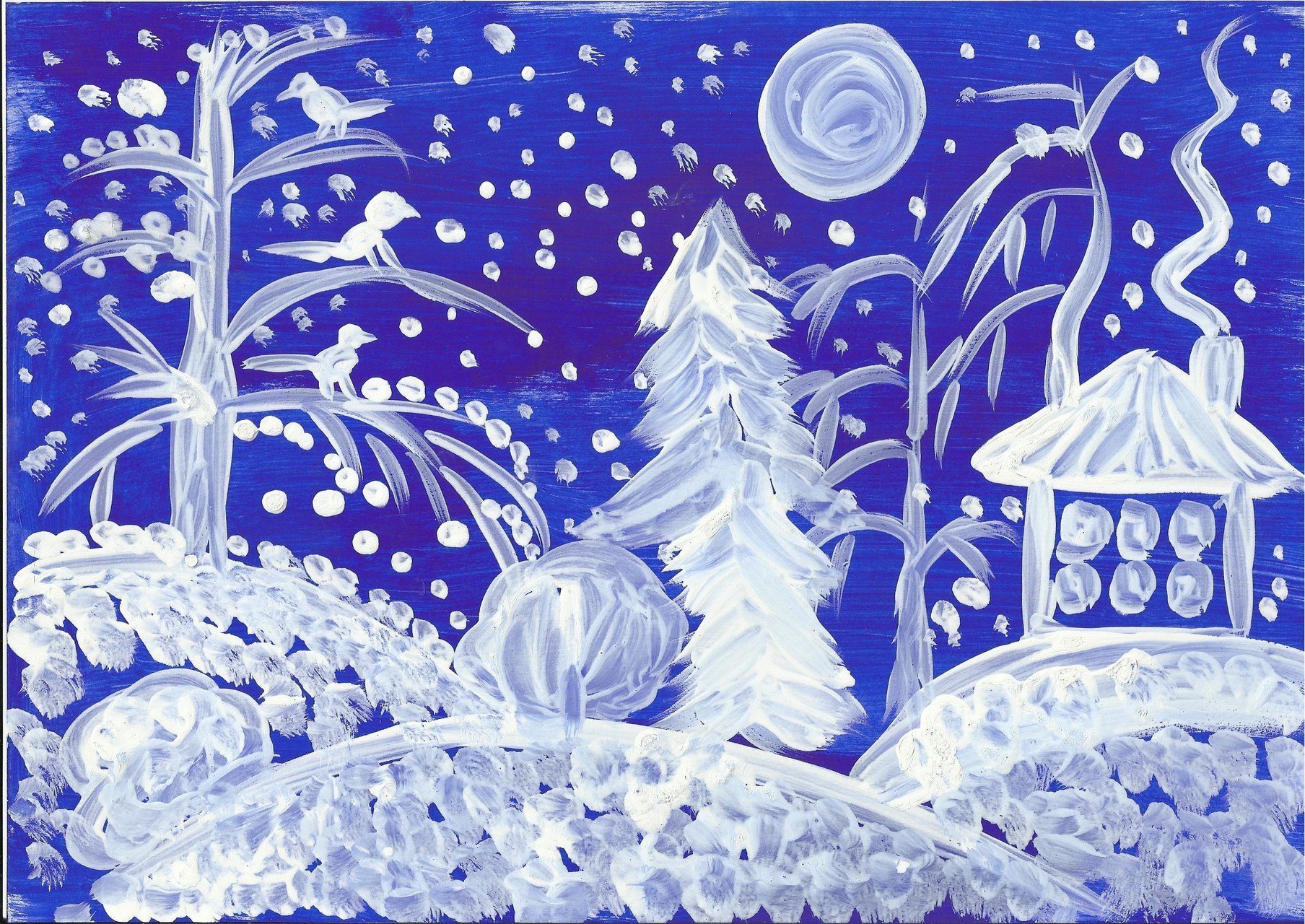 Зимний пейзаж белой гуашью на темном фоне