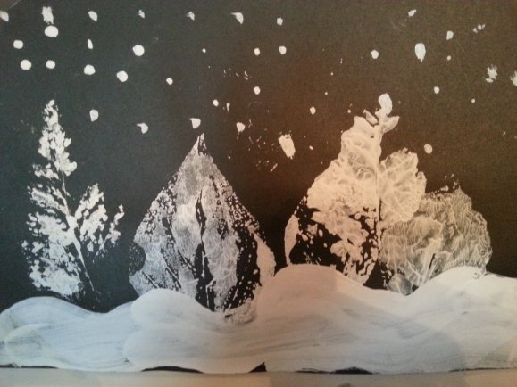Зимний пейзаж на черном фоне белой гуашью для детей