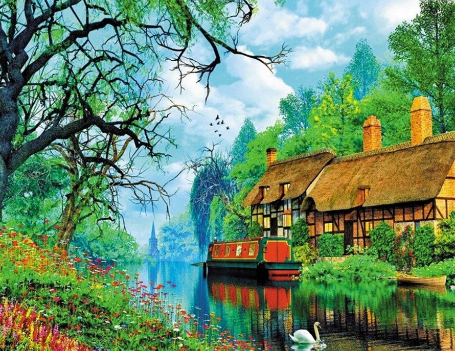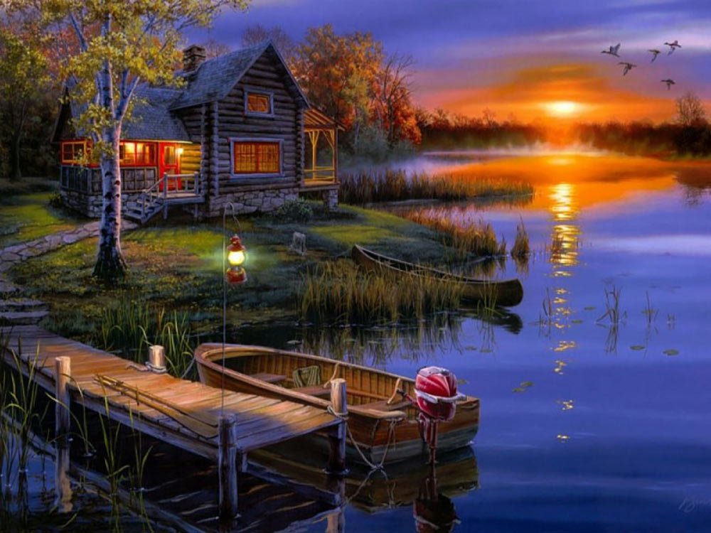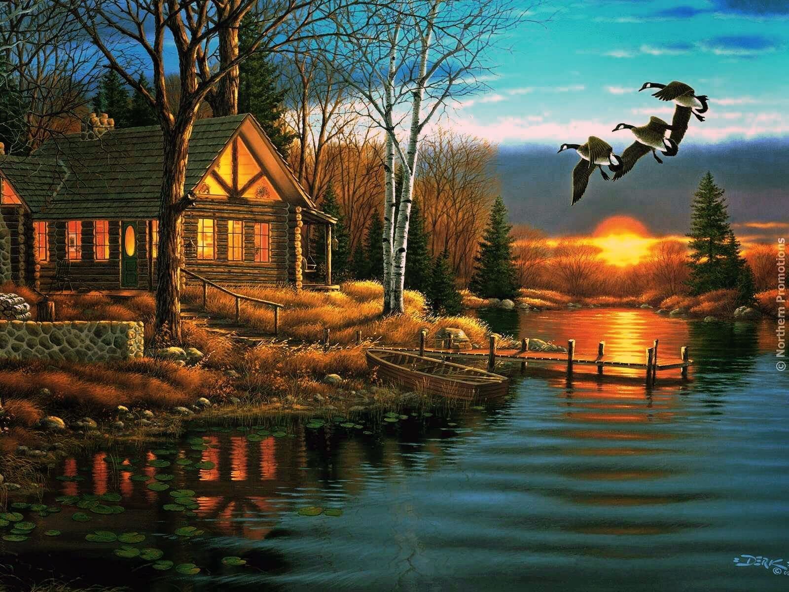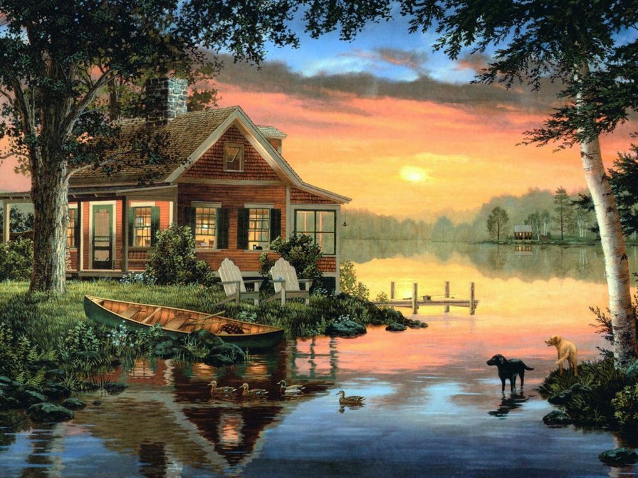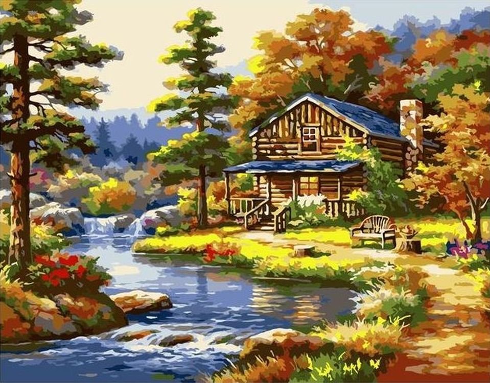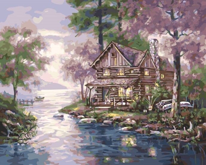 Домик у озера живопись