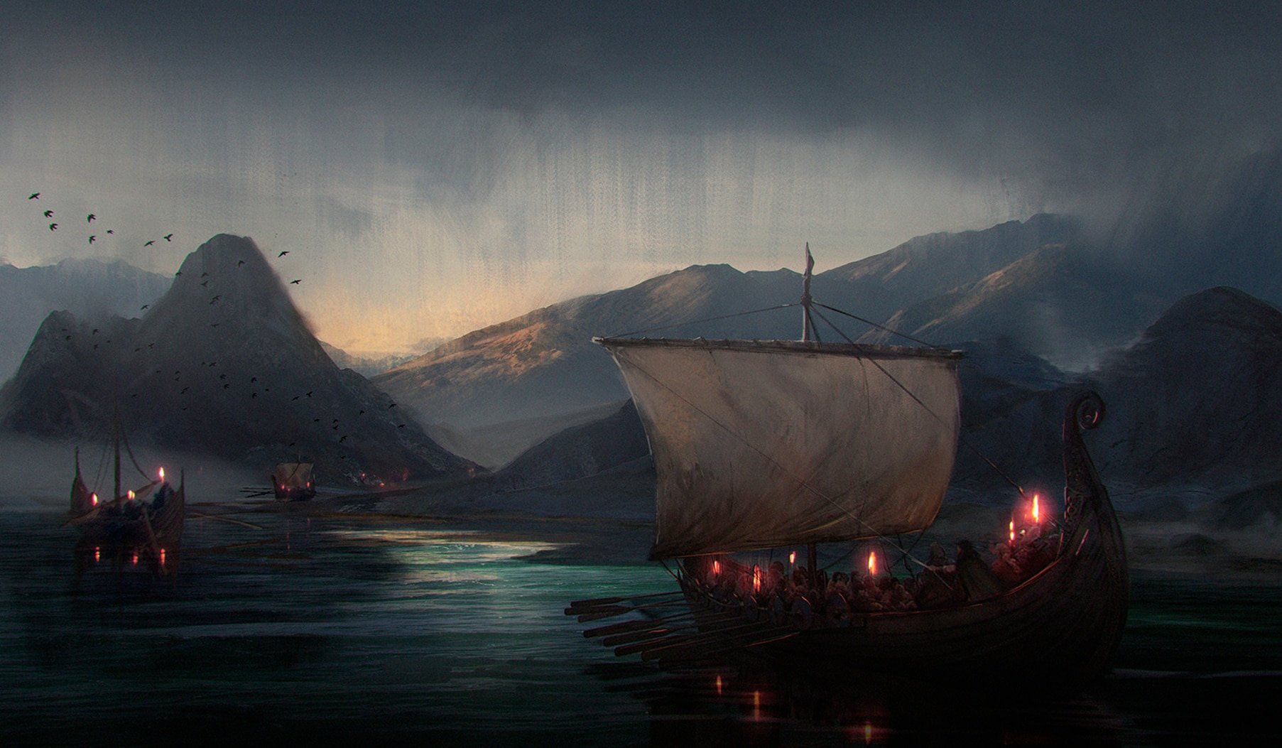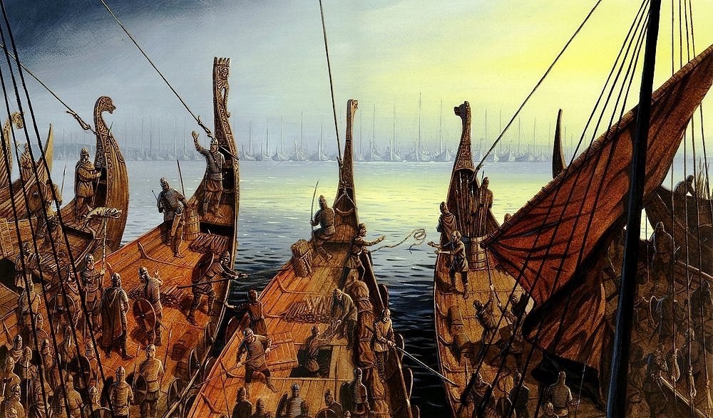 Викинги фэнтези арт Драккар деревня