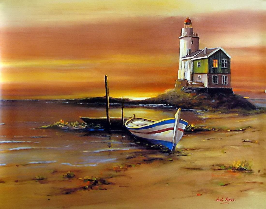 Художник Петерс море лодка Маяк