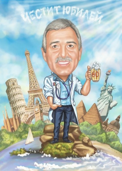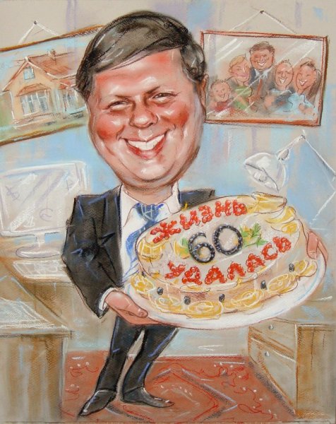 Шарж - это уникальный и запоминающийся подарок, который подойдет для любого особенного случая, включая 60-летие мужчины. Шарж - это комическое изображение, на котором обычно выделены особенности и черты лица, что делает его забавным и неповторимым. В таком шарже можно передать индивидуальность и характер именинника, а также добавить элементы, связанные с его увлечениями или профессией. Это оригинальный способ поздравить и порадовать именинника, устроить ему незабываемый сюрприз и вызвать улыбку на его лице.