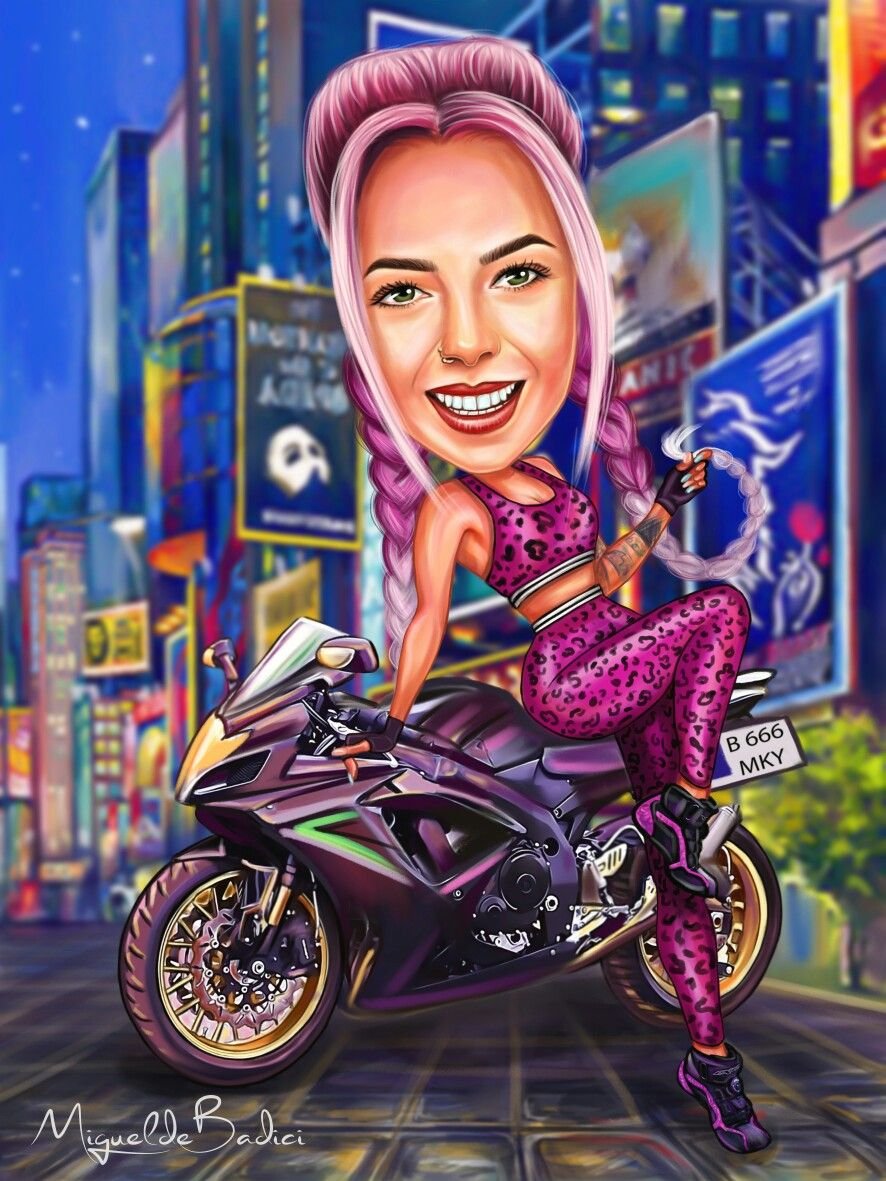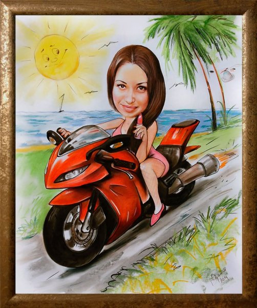 Шарж девушка на мотоцикле - это уникальное и забавное изображение, которое захватывает взгляд с первого взгляда. На рисунке можно увидеть стильную и смелую девушку, которая с легкостью оседлала свой мотоцикл и готова прокатиться по дорогам. Ее яркая одежда и аксессуары отражают ее индивидуальность и страсть к приключениям. Шарж позволяет наслаждаться неповторимым сочетанием женственности и мощи, создавая впечатление харизматичной и независимой личности, готовой покорять мир на двух колесах. Будьте готовы улыбаться и получать положительные эмоции, каждый раз взглянув на эту яркую картину.
