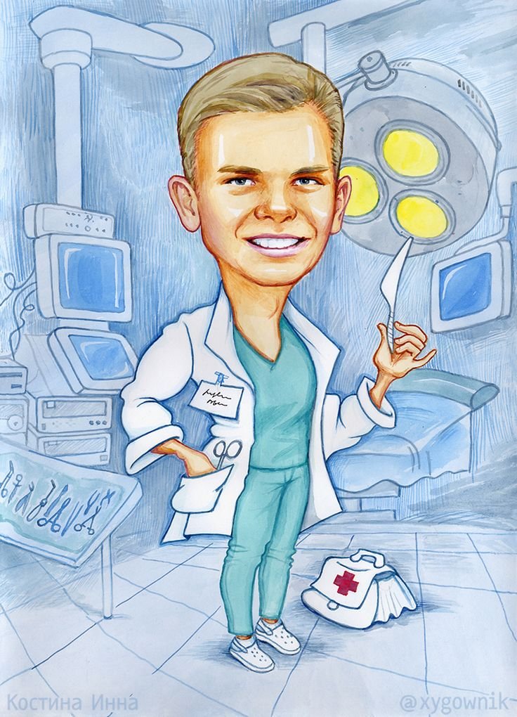 Шарж на хирурга - это карикатурное изображение, которое передает особенности и профессиональные черты данной профессии. Хирург - это специалист, обладающий высокой мастерством и навыками в проведении операций и медицинских процедур. В шарже на хирурга можно увидеть юмористическое изображение характерных атрибутов и поведения этого профессионала, таких как хирургическая маска, инструменты, скрупулезность и точность в работе, а также возможно изображение сцены операции с необычными и комическими деталями. Шарж на хирурга может быть использован в различных ситуациях, для создания юмористического эффекта или просто для поднятия настроения.