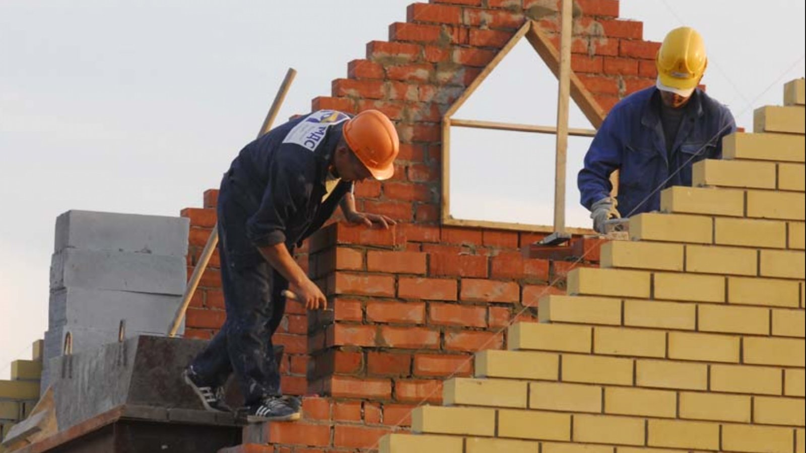 ![Строители строят дом]()