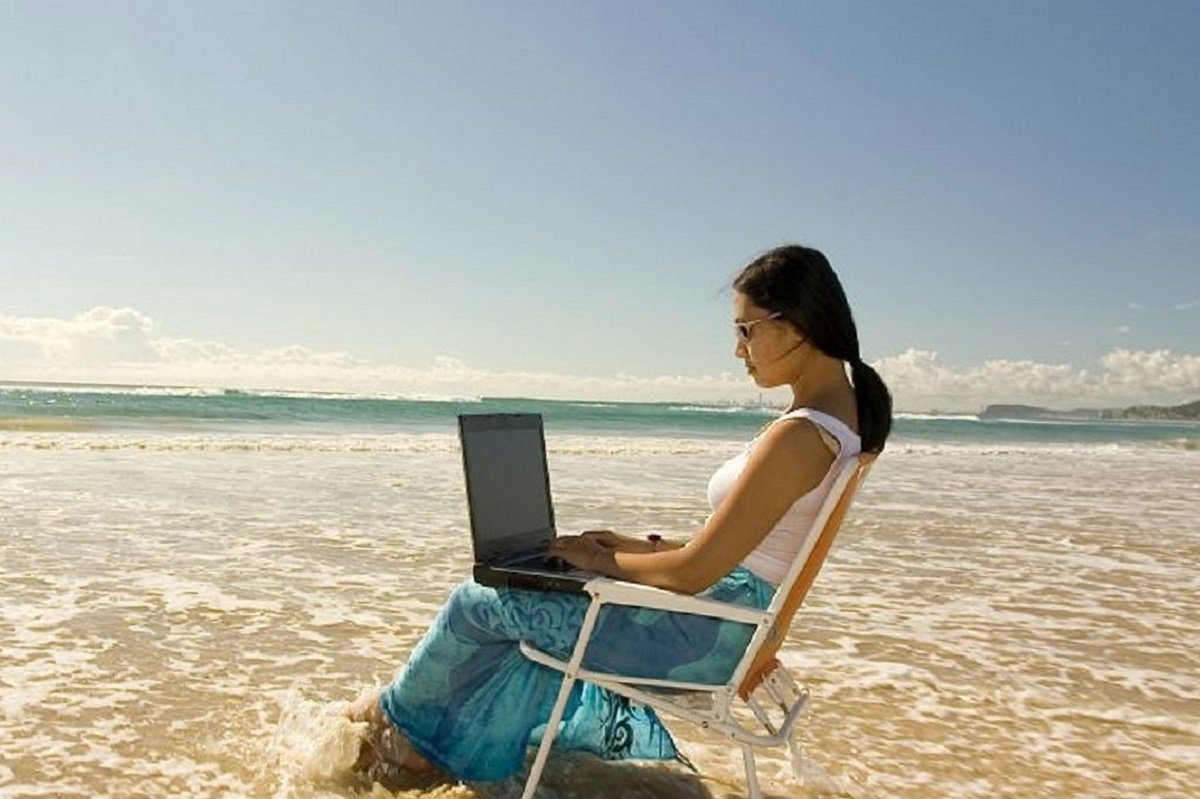 ![Девушка с ноутбуком на пляже]()