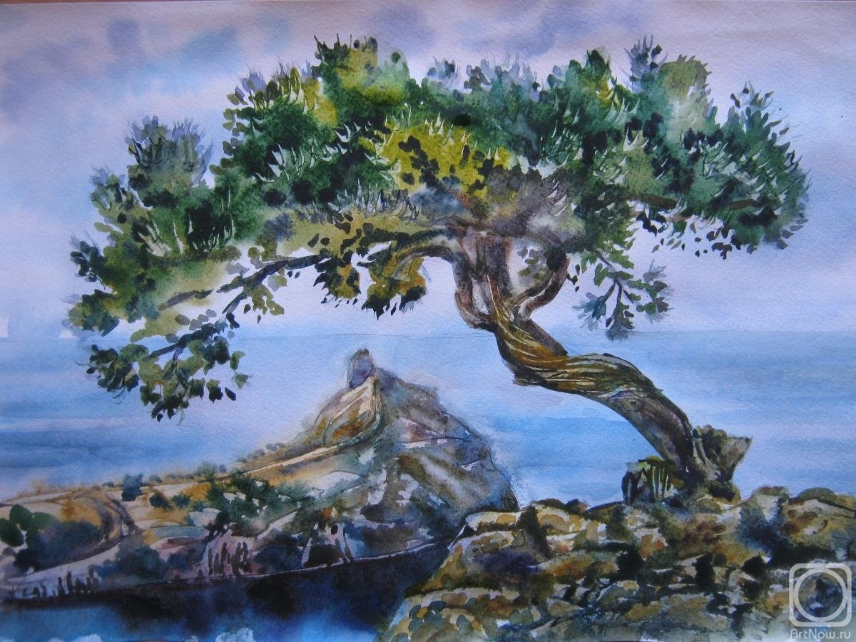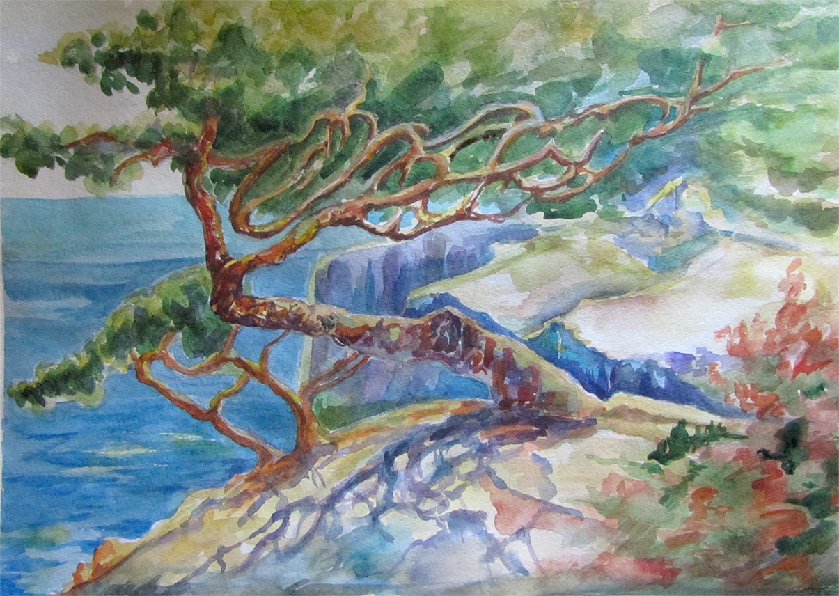 ![Акварель сосна на берегу]()