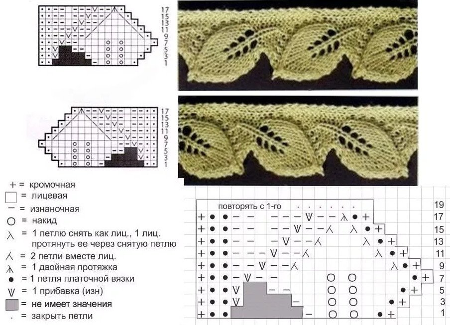 ![Вязаные листики спицами с описанием и схемами]()