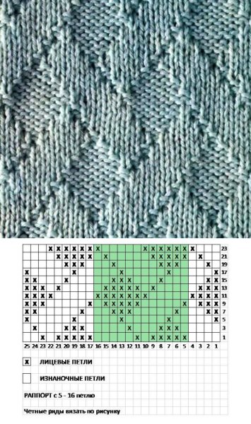 ![Узор спицами ромбы из лицевых и изнаночных петель схемы и описание]()