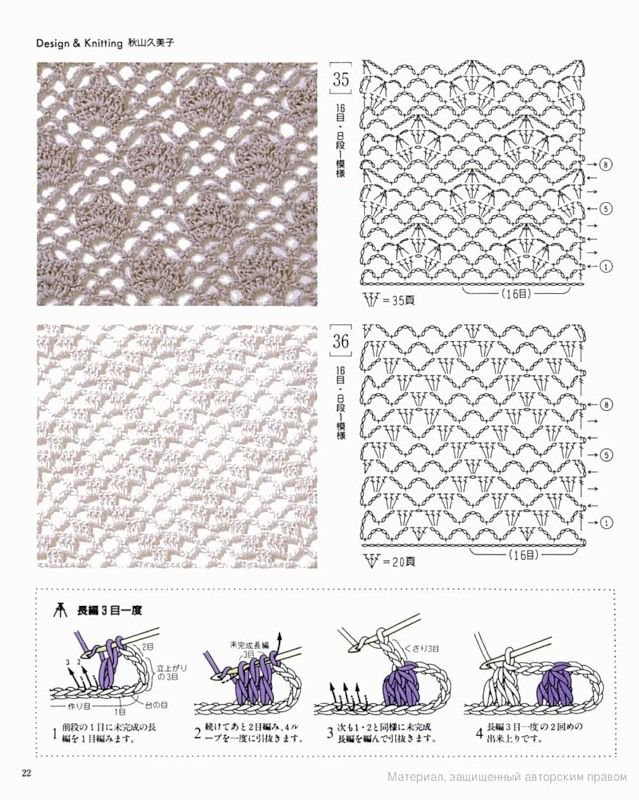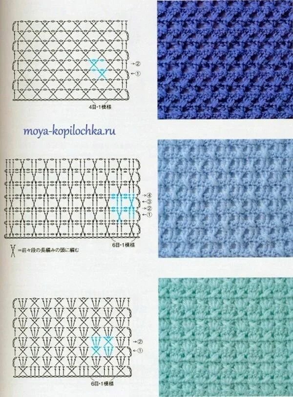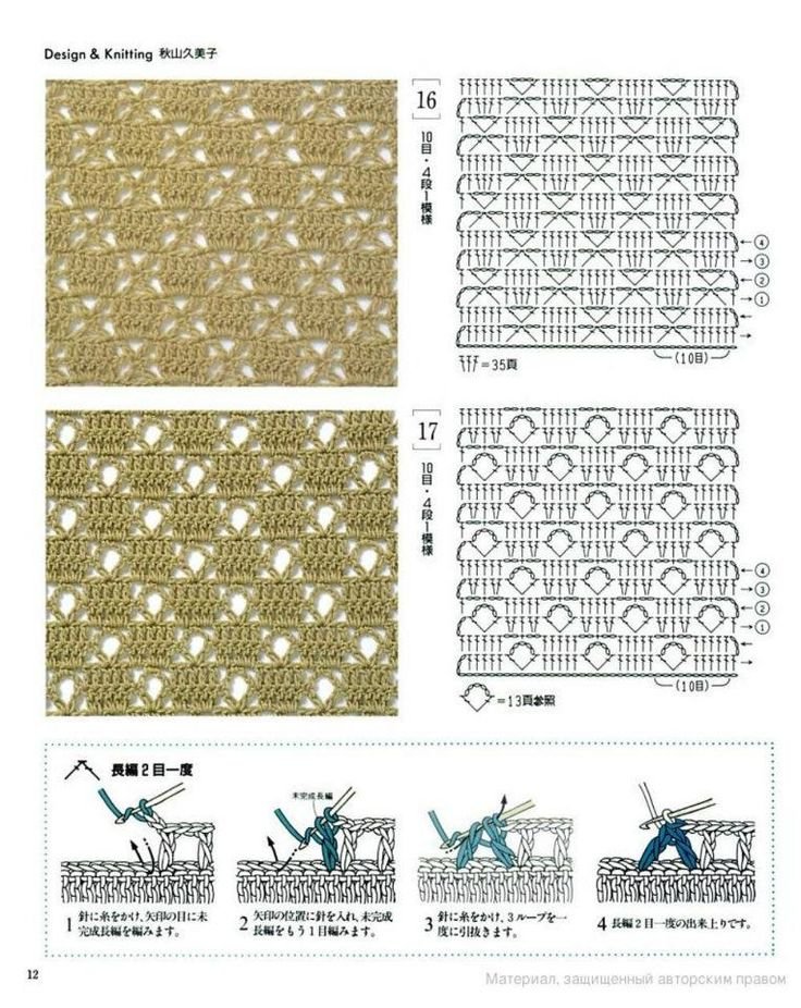 ![Вязаные узоры крючком со схемами]()