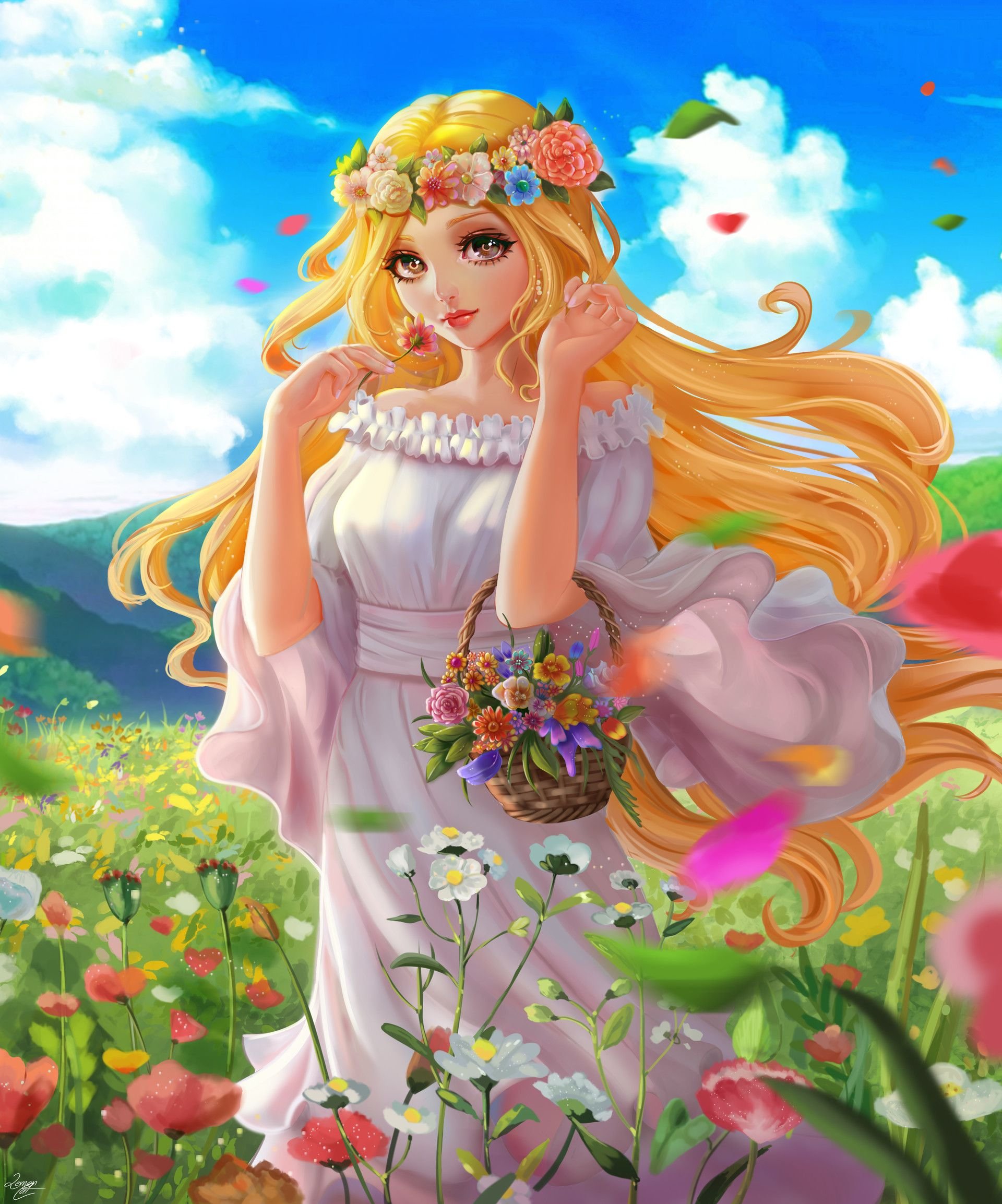 ![Нарисованная девушка в цветах]()