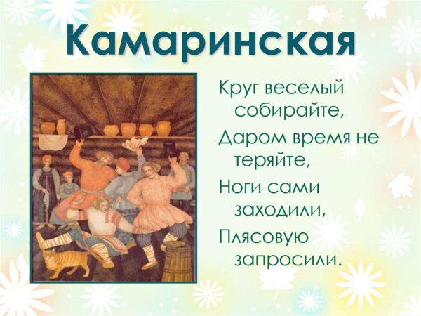 Камаринская рисунок - это уникальное искусство, которое восходит к древним временам. Этот стиль характеризуется особой элегантностью и изяществом линий, создавая впечатление плавности и грации. Камаринская рисунок часто используется в оформлении предметов интерьера или в настенной живописи, добавляя в помещение нотки роскоши и изысканности. Он может быть выполнен в различных цветовых гаммах, от нежных пастельных оттенков до ярких и контрастных комбинаций. Каждый рисунок уникален и имеет свою собственную историю, что делает камаринскую технику особенно привлекательной для любителей искусства.
