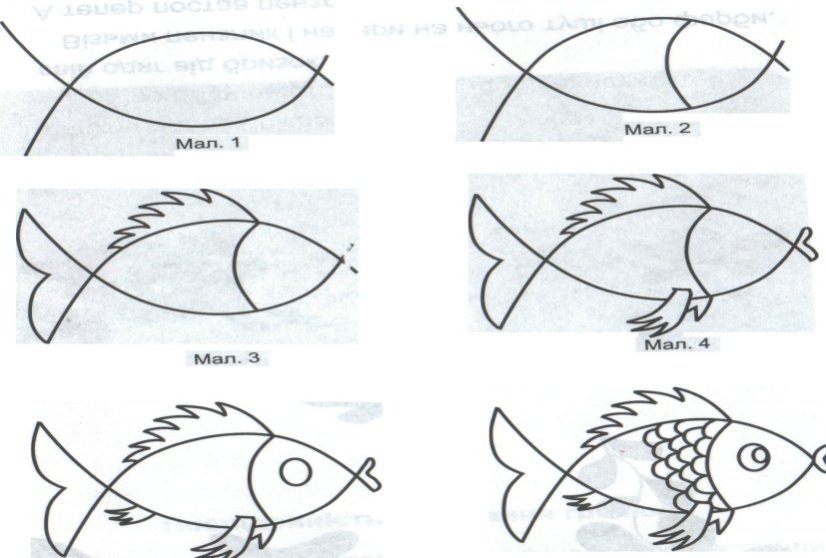![Этапы рисования рыбки]()