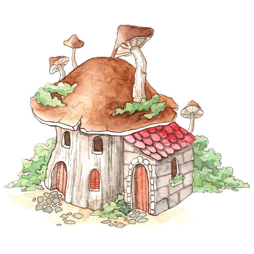 Домики грибы иллюстрации акварелью