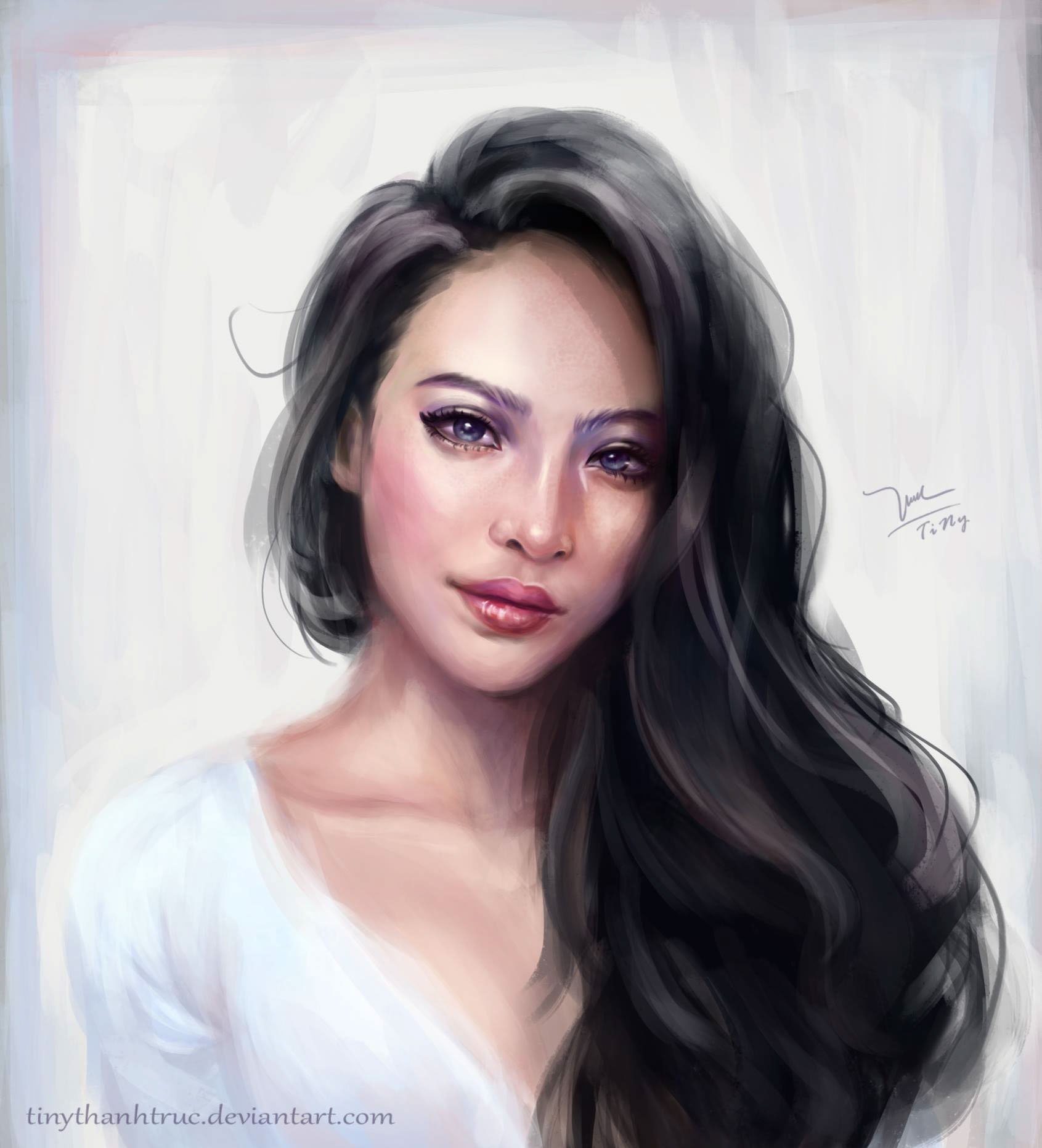 ![Брюнетка с чёлкой нарисованная акварелью]()