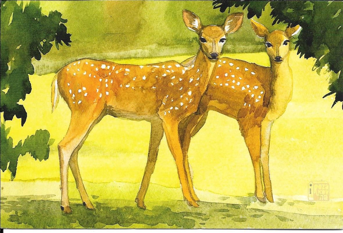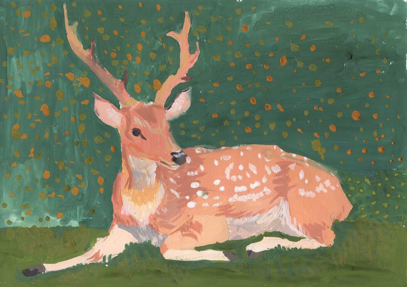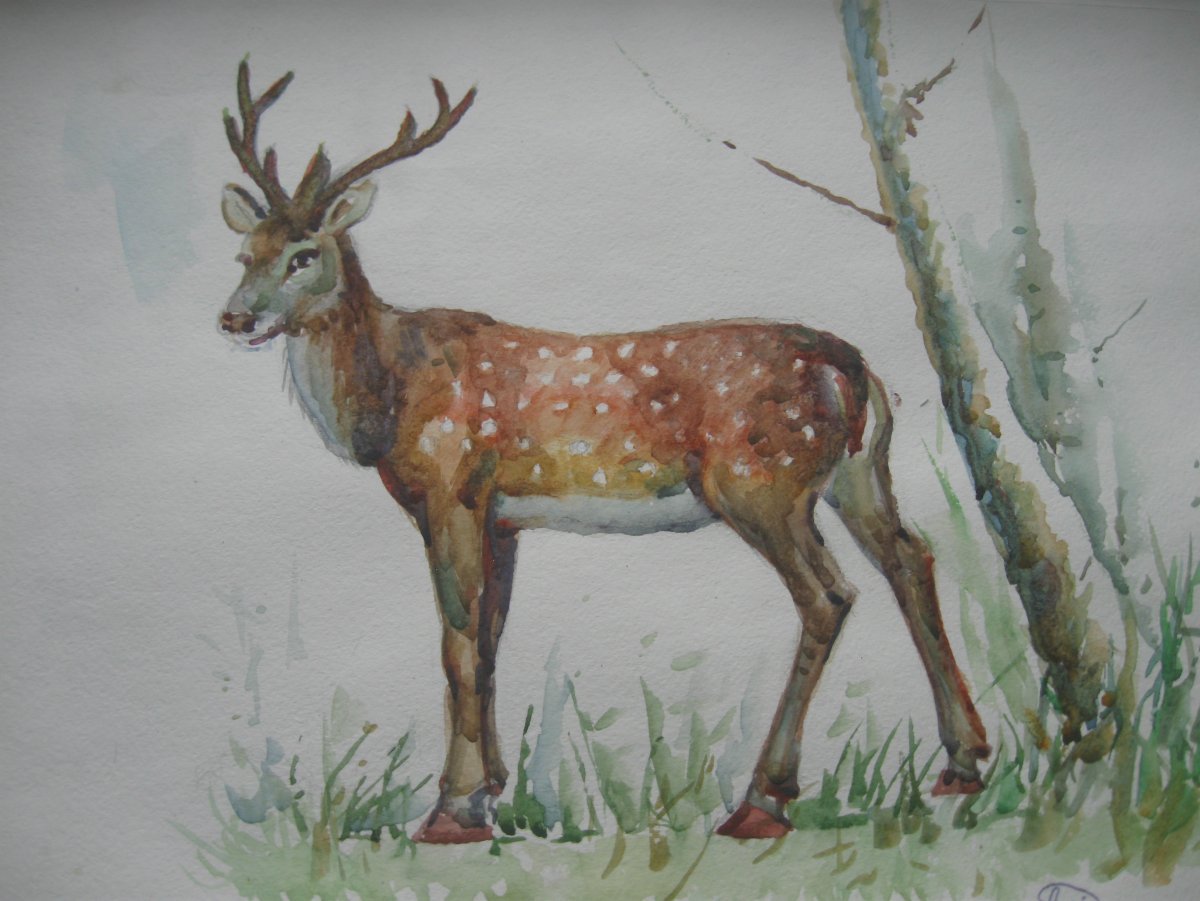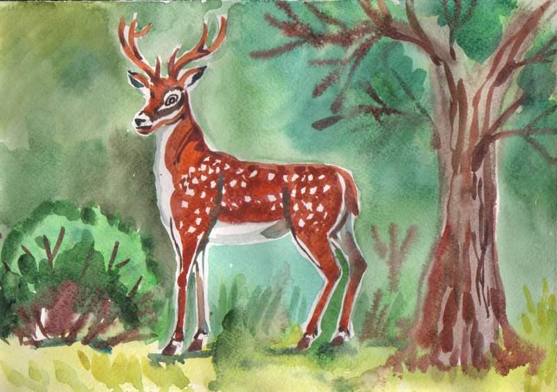 ![Пятнистый олень акварель]()