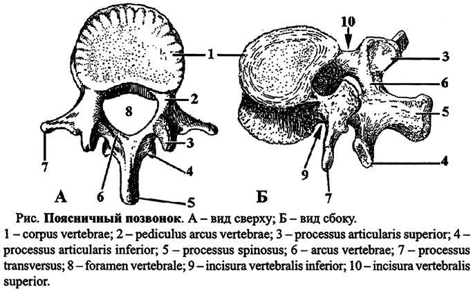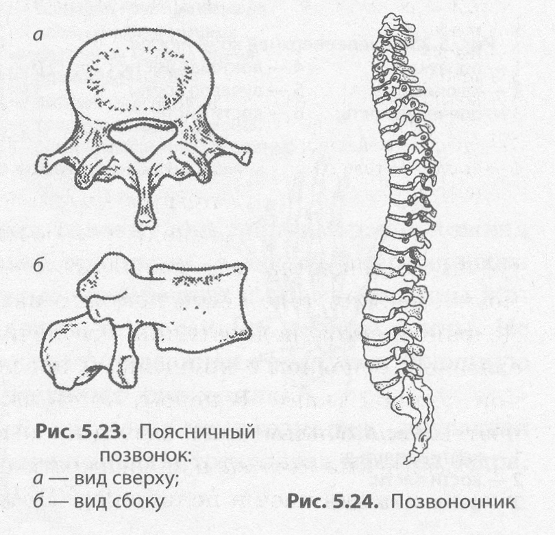 ![Рис. 21. Шейный (а), грудной (б) и поясничный (в) позвонки:]()