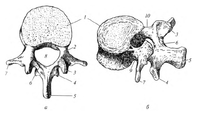 Рис. 21. Шейный (а), грудной (б) и поясничный (в) позвонки: