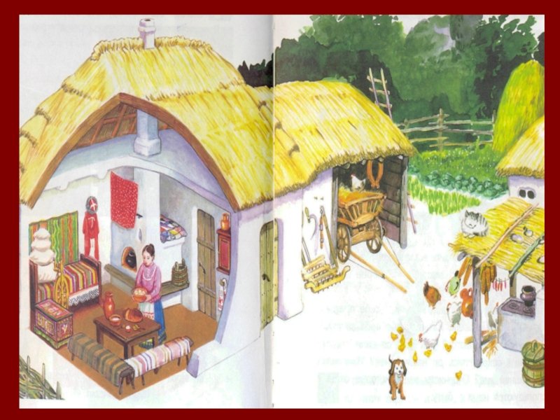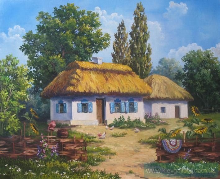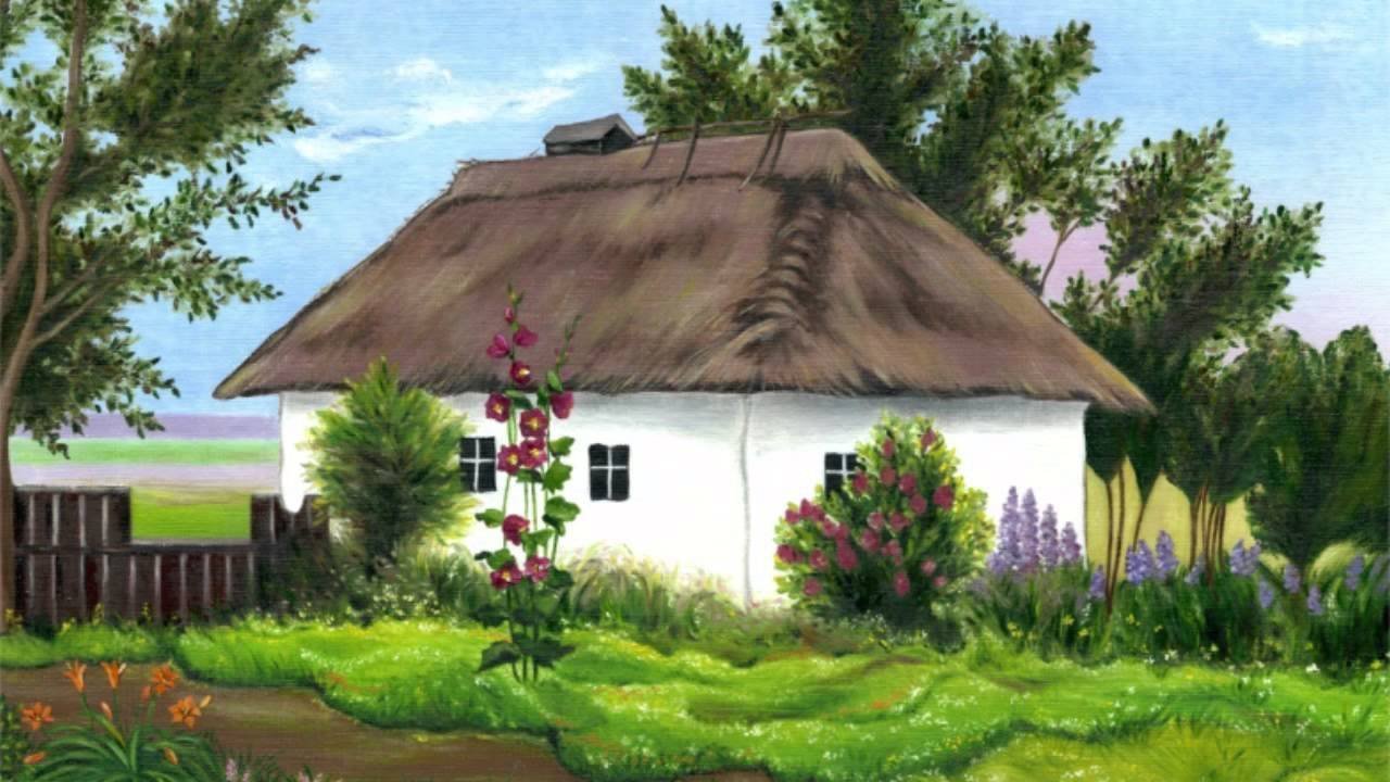 ![Украинская хата Мазанка Подсолнухи, мальвы]()