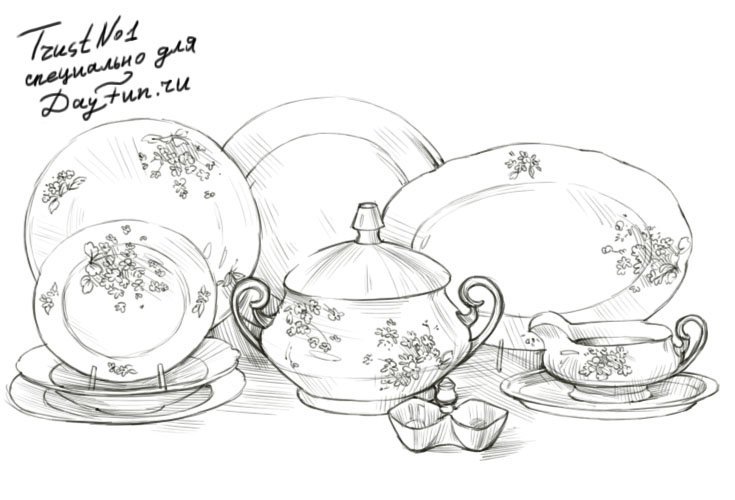 ![Посуда карандашом]()