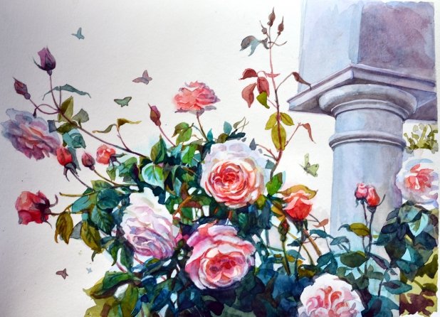 Кустарниковые розы акварель