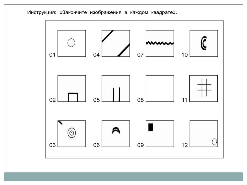 ![Рисуночный тест е. Торренса неполные фигуры]()